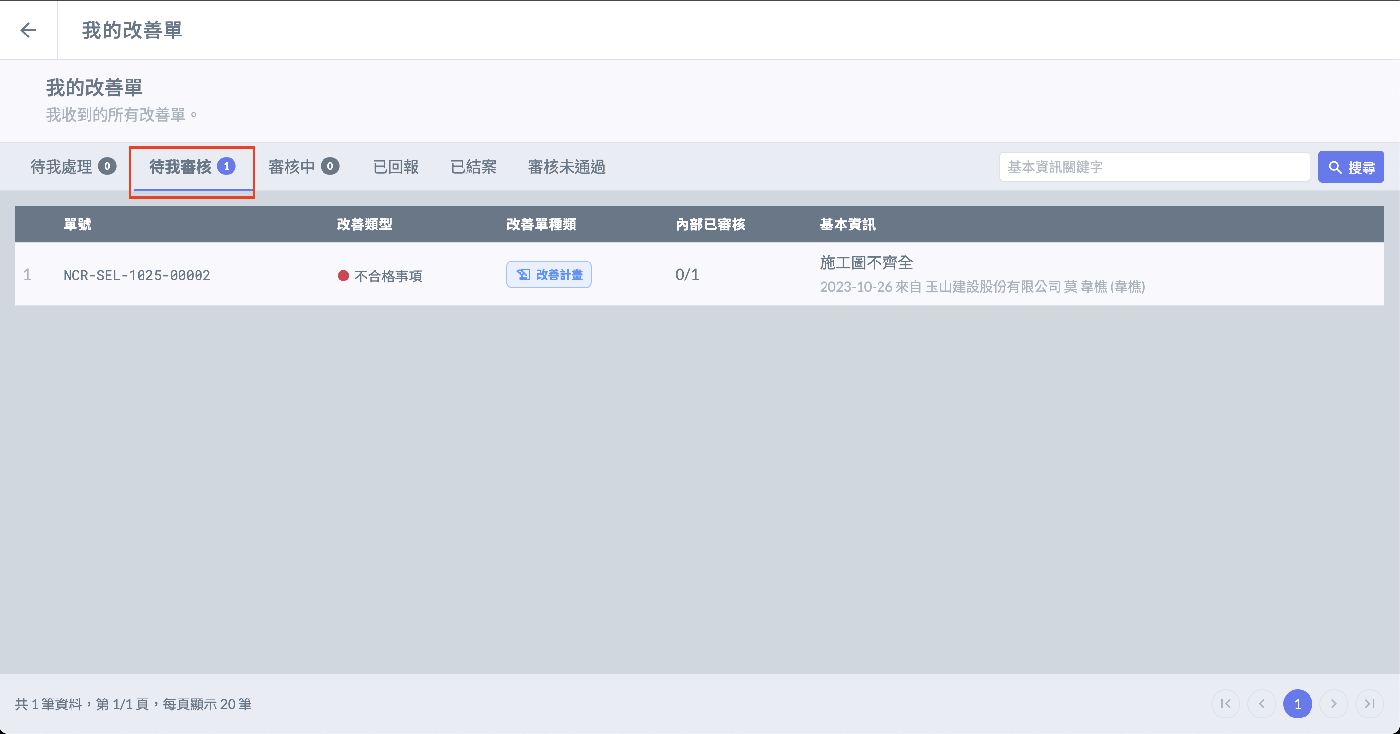 #### 一、受文方審核人進入 「 我的改善單 」 後，可在 「 待我審核 」 分頁找到改善單。 ![](https://content.gitbook.com/content/EqUCL3D5WQfpxJw8NL3P/blobs/RIo6qt5j107bfaFjUE27/%E5%8F%97%E6%96%87%E6%96%B9%E5%85%A7%E9%83%A8%E5%AF%A9%E6%A0%B8-1.jpg)