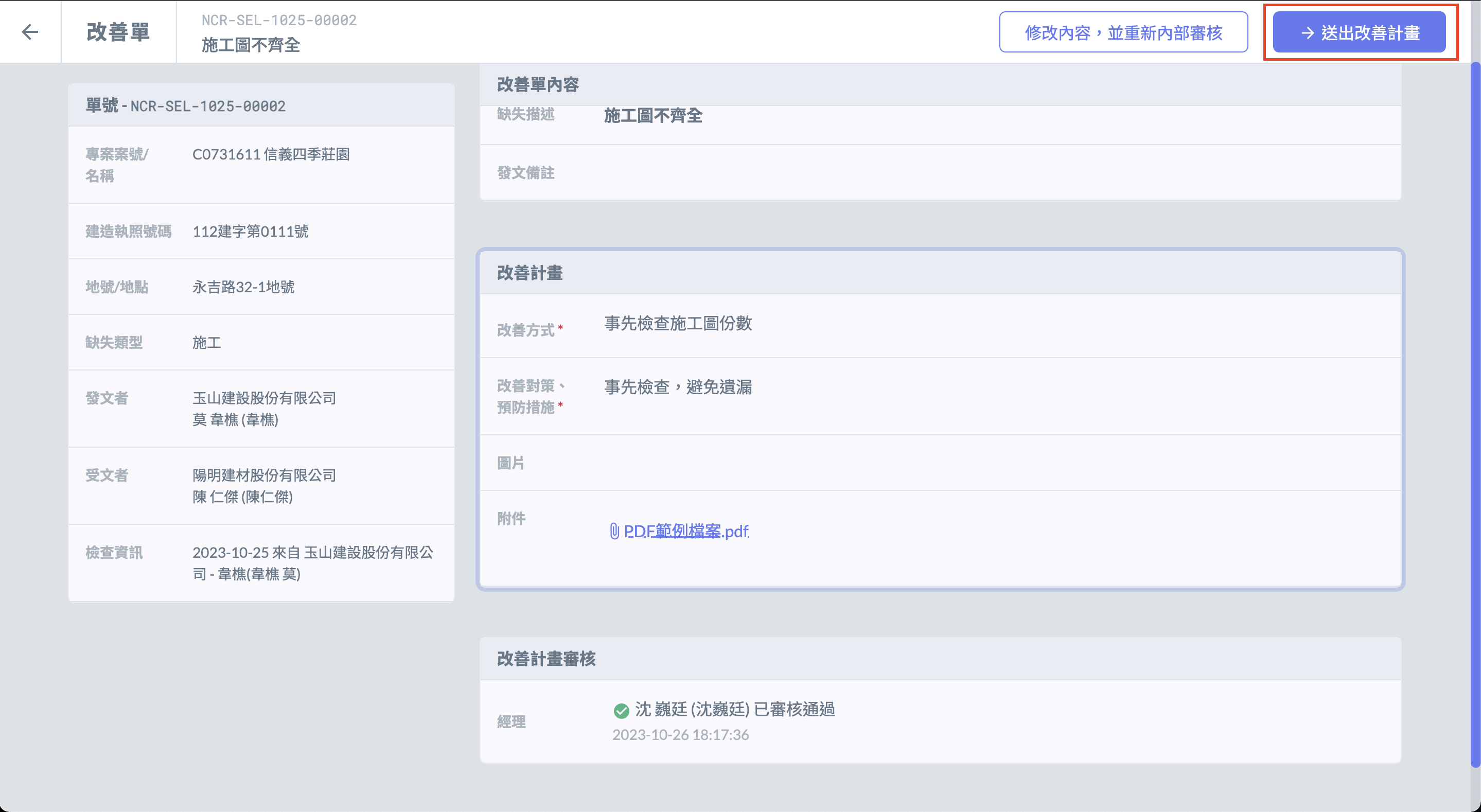 #### 二、進入改善單後，可選擇 「 拒絕審核 」 或 「 審核通過 」。 ![](https://content.gitbook.com/content/EqUCL3D5WQfpxJw8NL3P/blobs/GsiD6wagC3k74Cl5bP0r/%E5%8F%97%E6%96%87%E6%96%B9%E5%85%A7%E9%83%A8%E5%AF%A9%E6%A0%B8-2.jpg)  ![](https://content.gitbook.com/content/EqUCL3D5WQfpxJw8NL3P/blobs/V2tPQdf6CPHrn6y4q0QH/%E5%8F%97%E6%96%87%E6%96%B9%E5%85%A7%E9%83%A8%E5%AF%A9%E6%A0%B8-3.jpg)