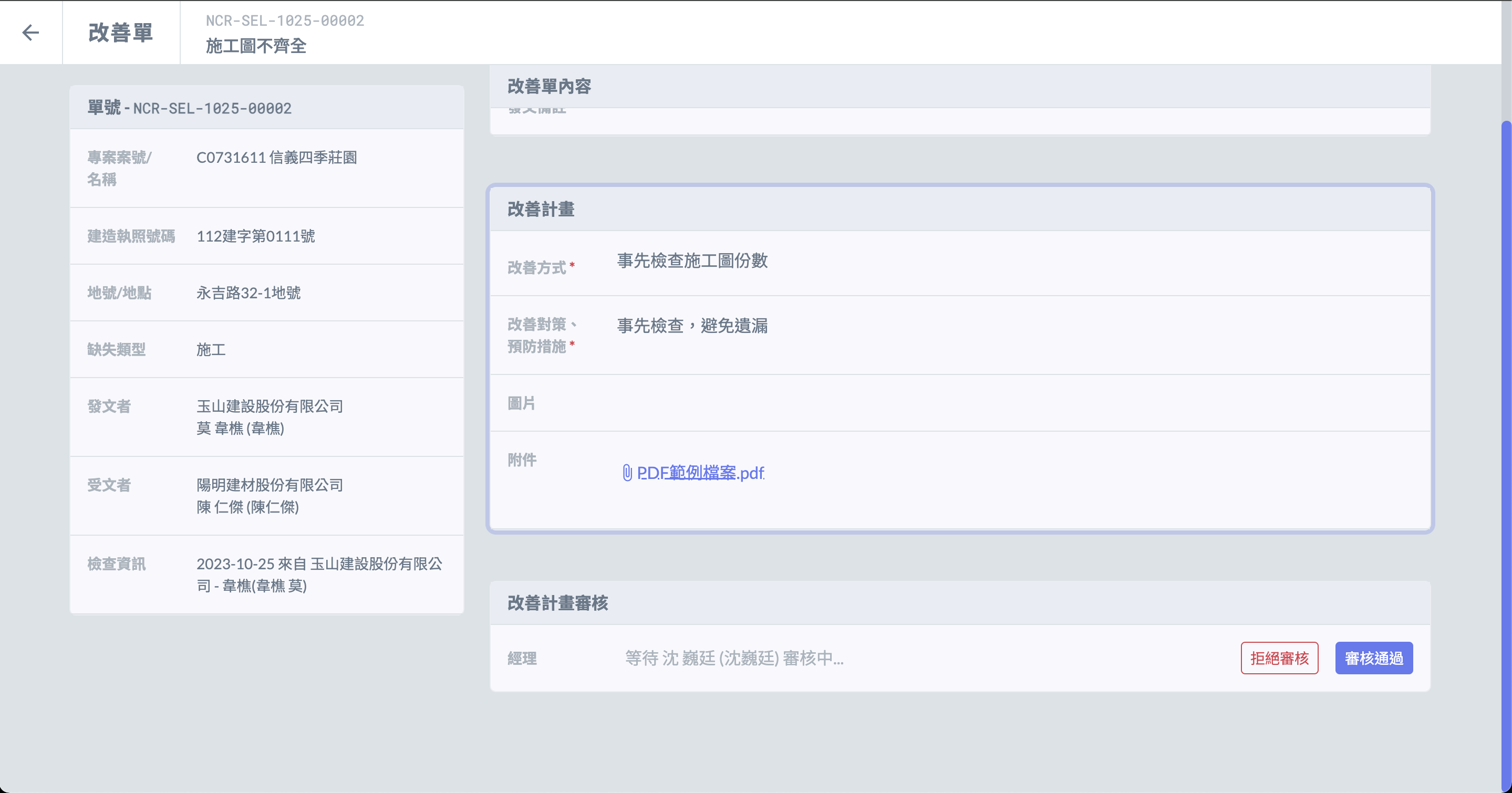 #### 二、進入改善單後，可選擇 「 拒絕審核 」 或 「 審核通過 」。