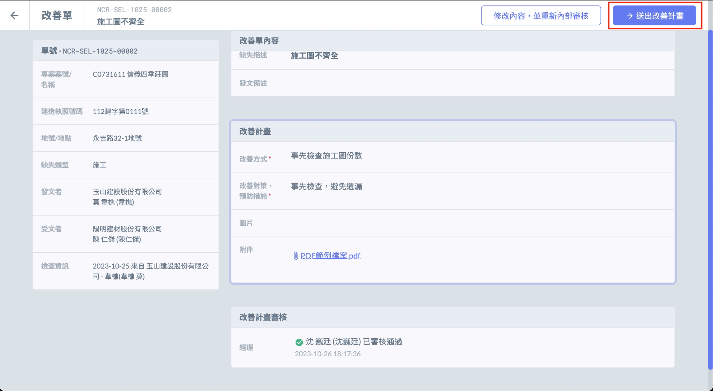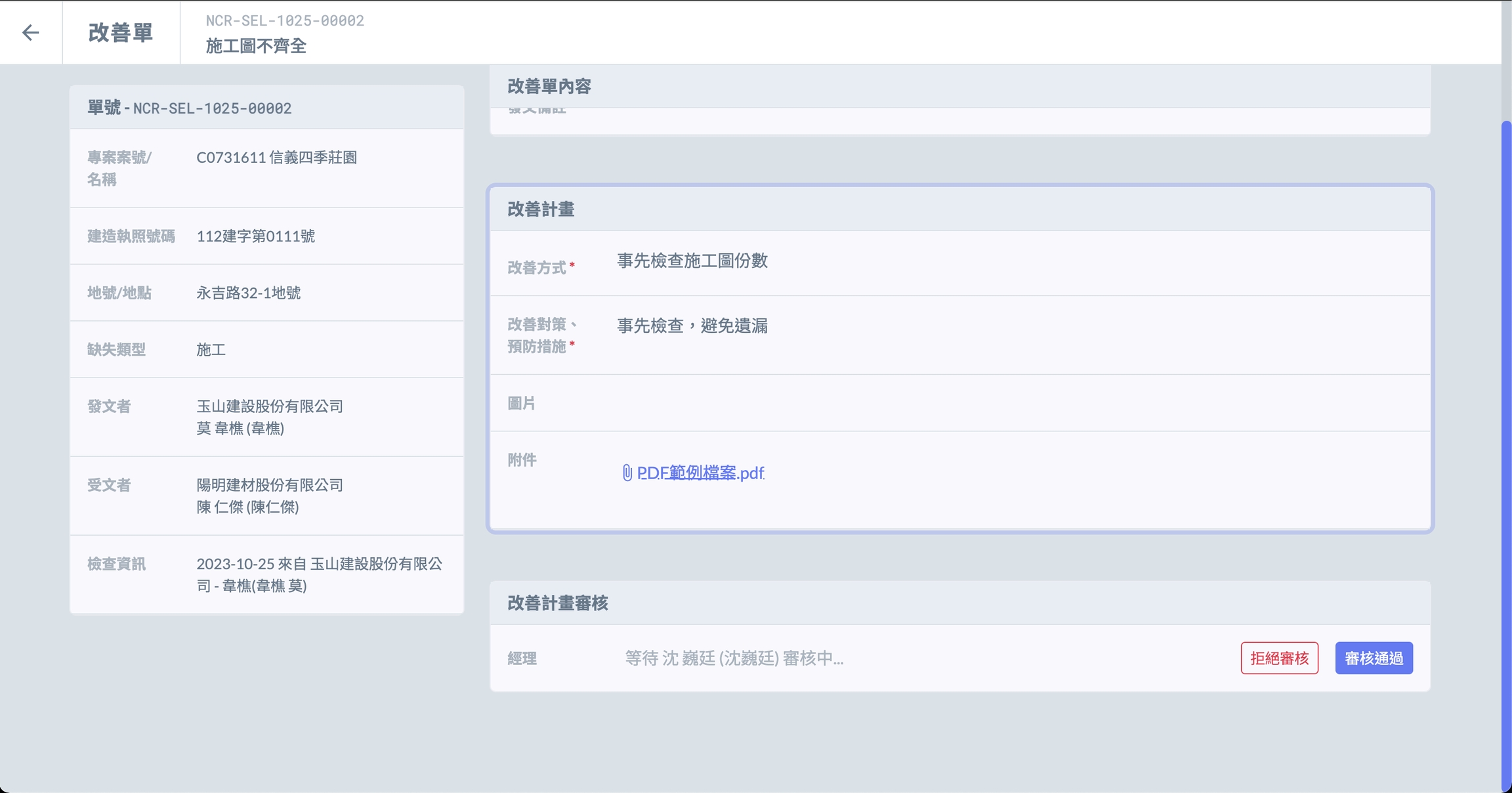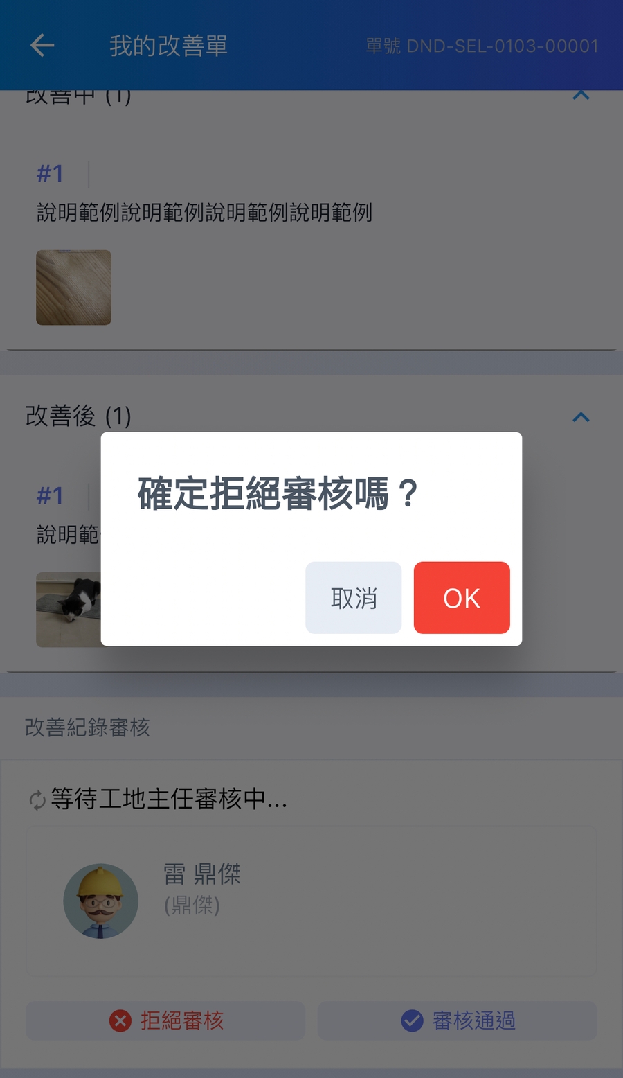 二、進入改善單後,可選擇 「 拒絕審核 」 或 「 審核通過 」。