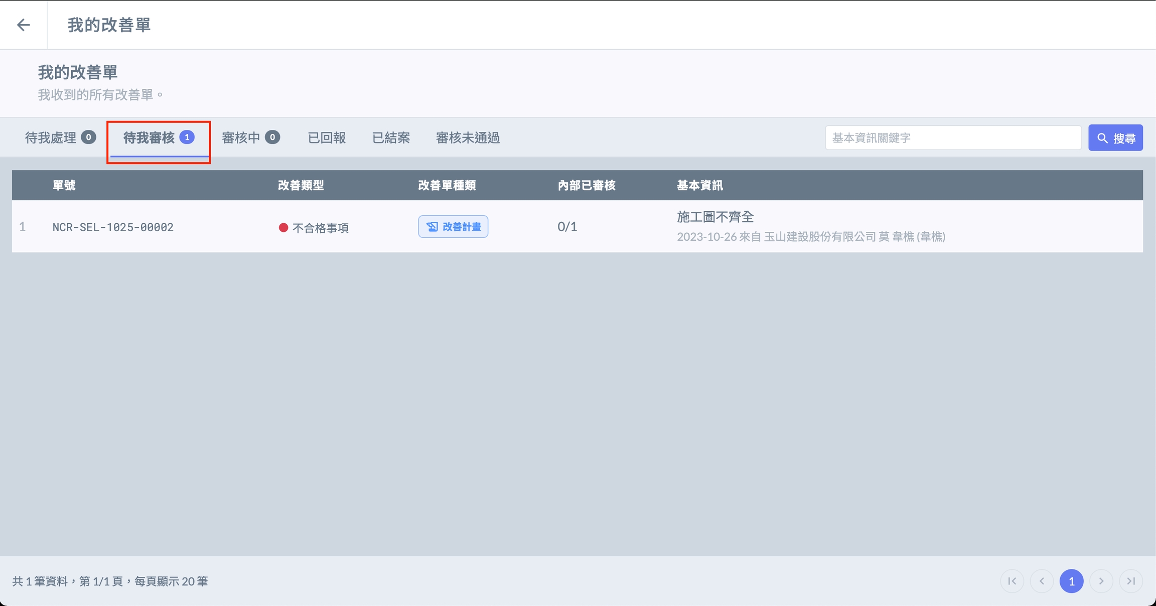 一、審核人進入 「 我的改善單 」 後,可在 「 待我審核 」 分頁找到改善單。