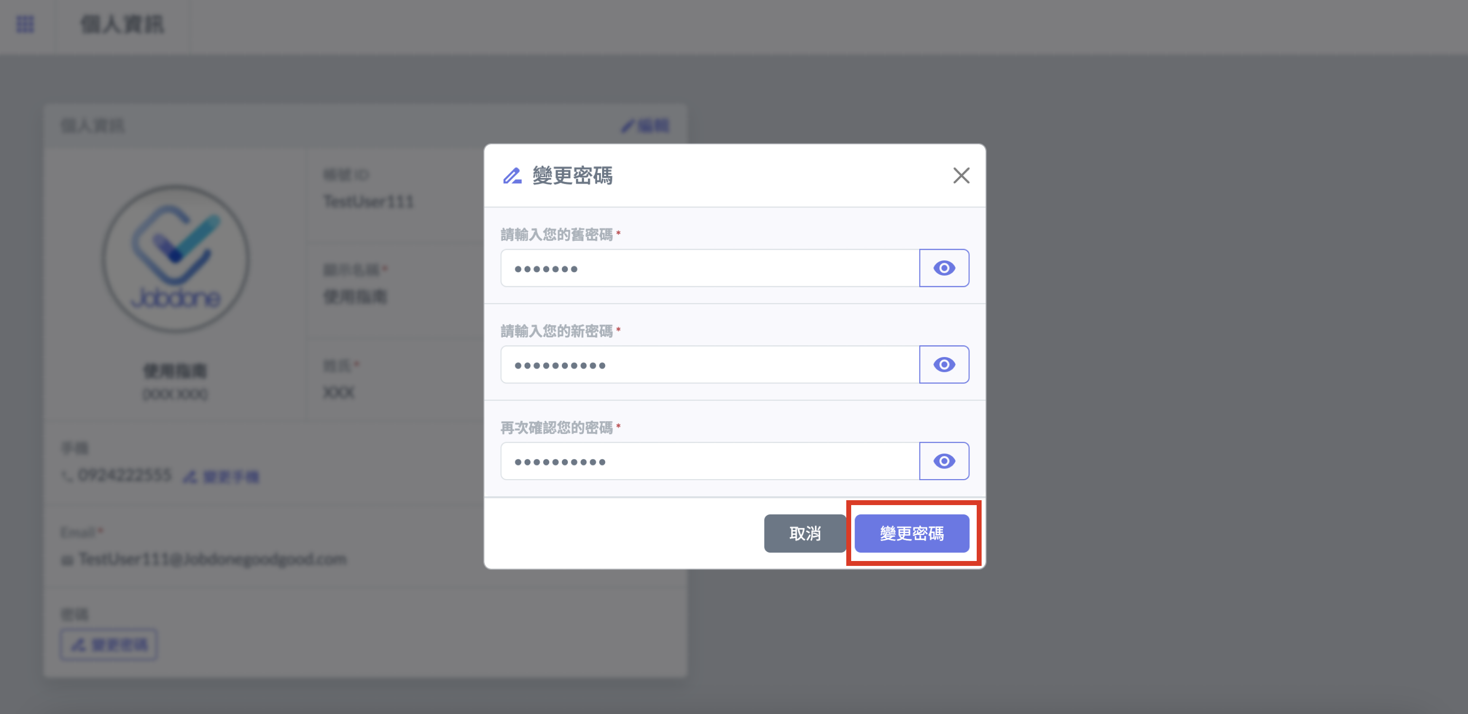 請先輸入您的舊密碼，再輸入您的新密碼並再次確認。確認無誤後，請點選<kbd><mark style="color:purple;">**變更密碼**<mark style="color:purple;"></kbd>。