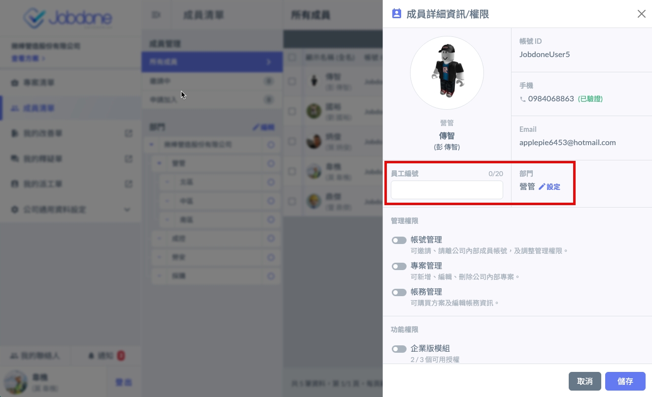 點選成員帳號右方的選單鈕,選擇 「 查看詳細資訊 / 權限 」,即可為員工設定部門,也為員工輸入編號。