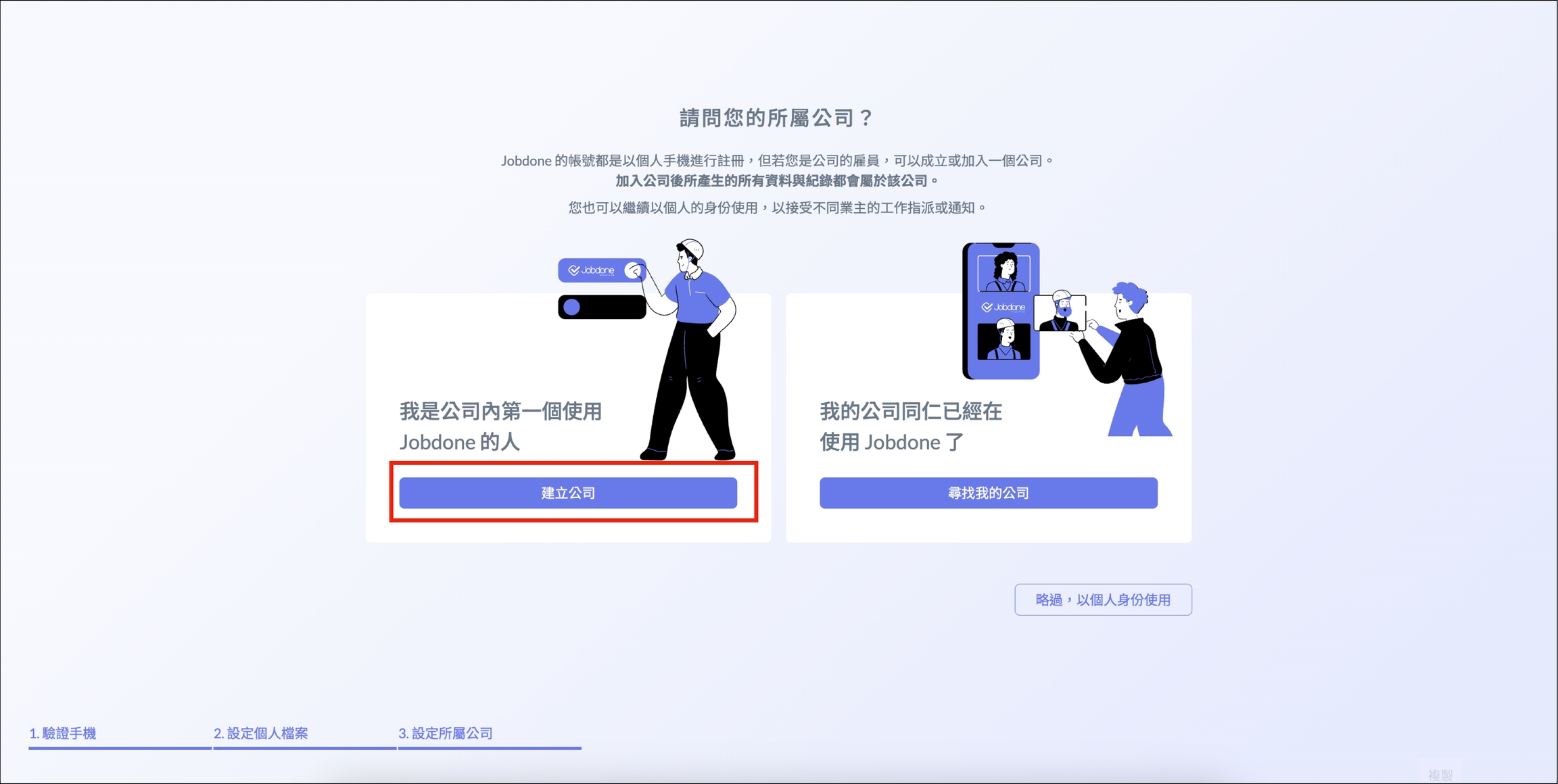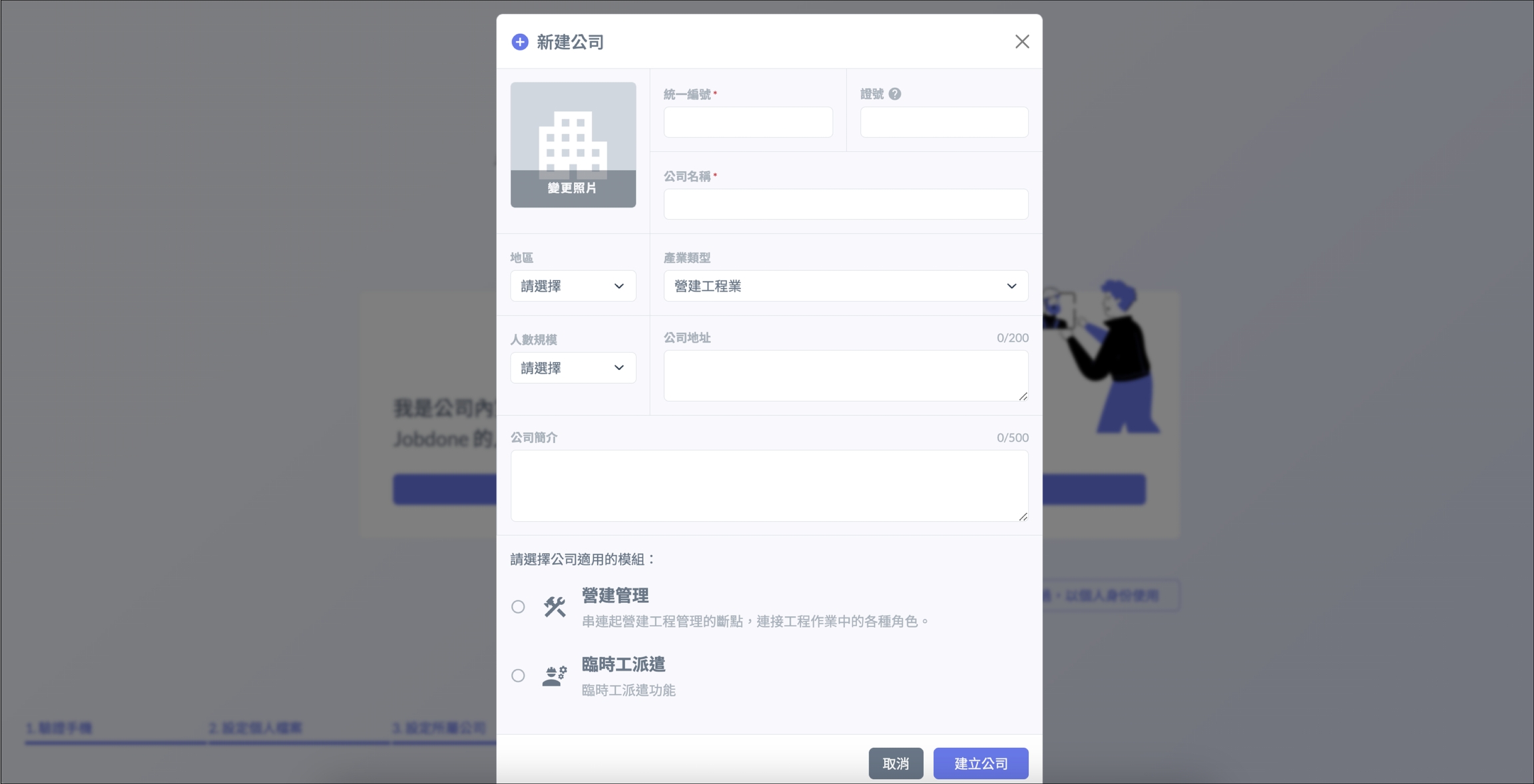 註冊個人帳號後,若您是公司第一位使用 Jobdone 的用戶,可點選 「 建立公司 」 ,輸入相關資料並選擇適用模組後,即可建立公司。