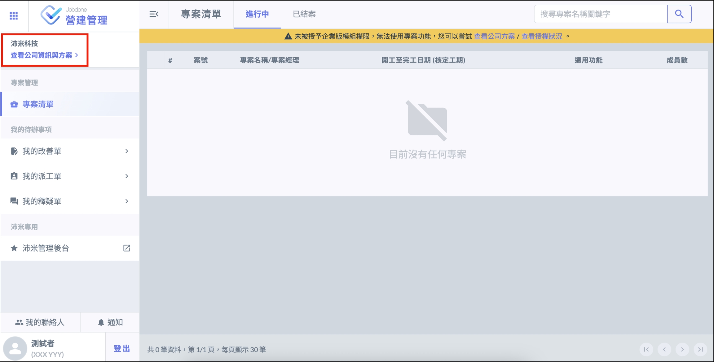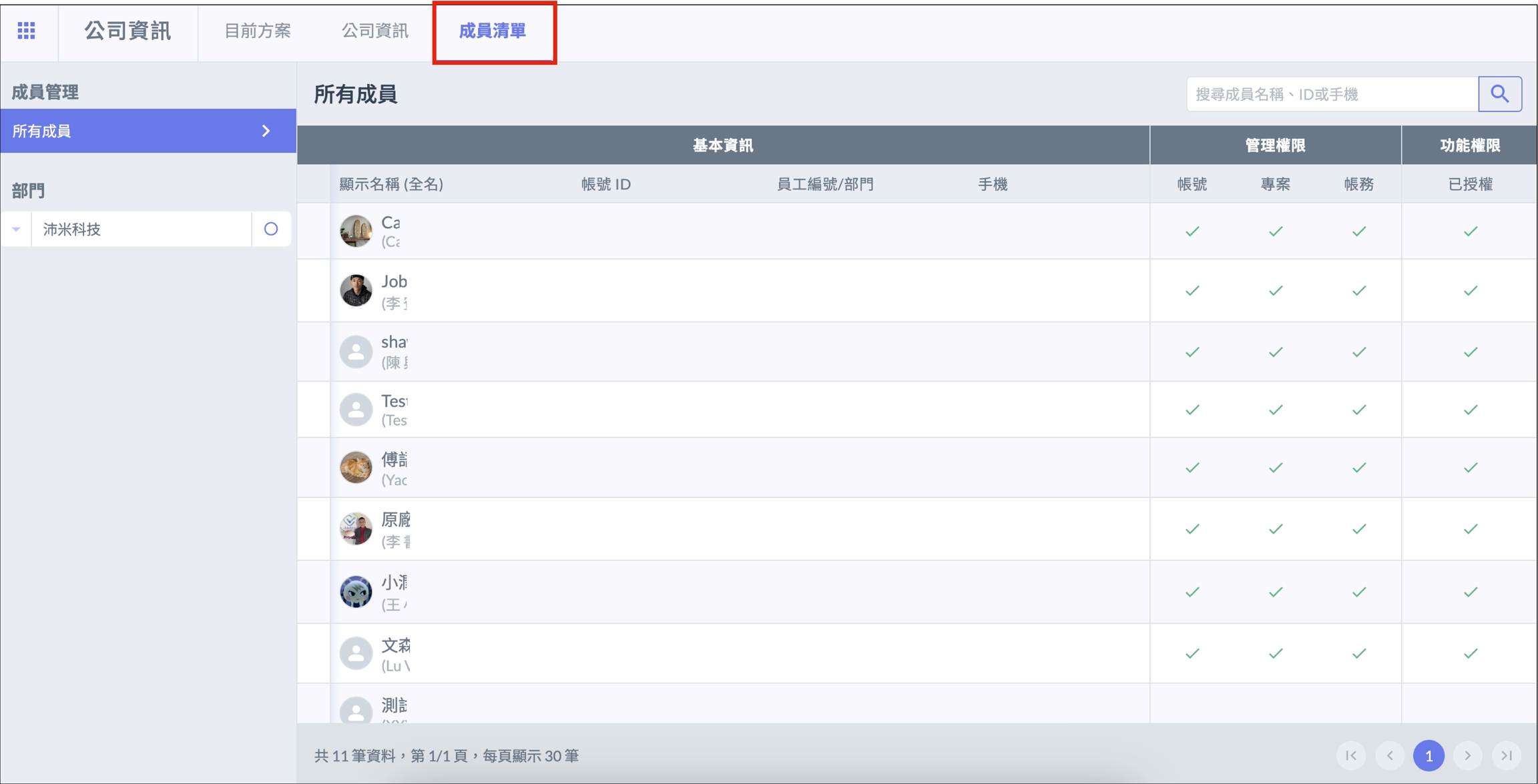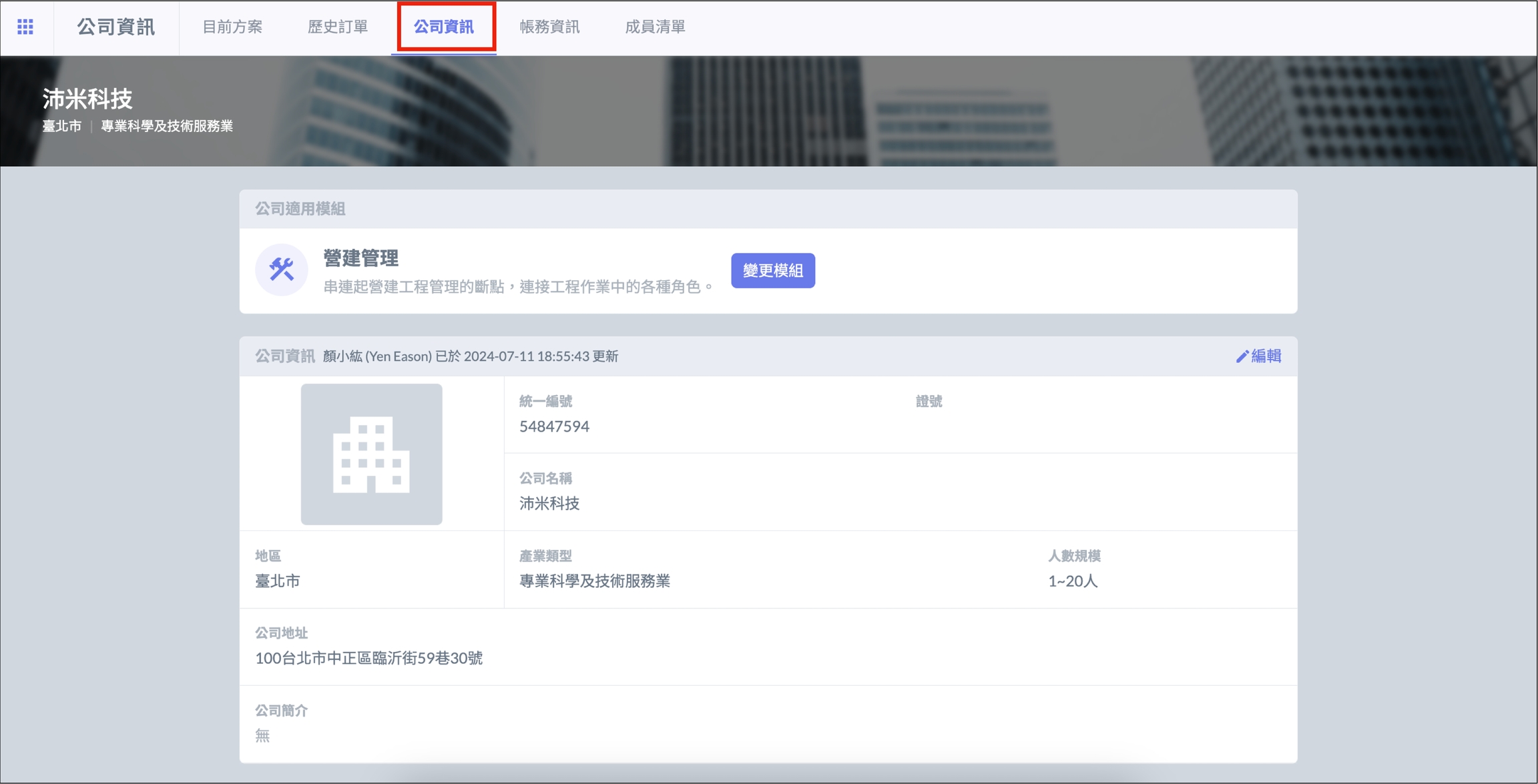 公司資訊可以查看公司目前使用的功能模組以及詳細資料。
