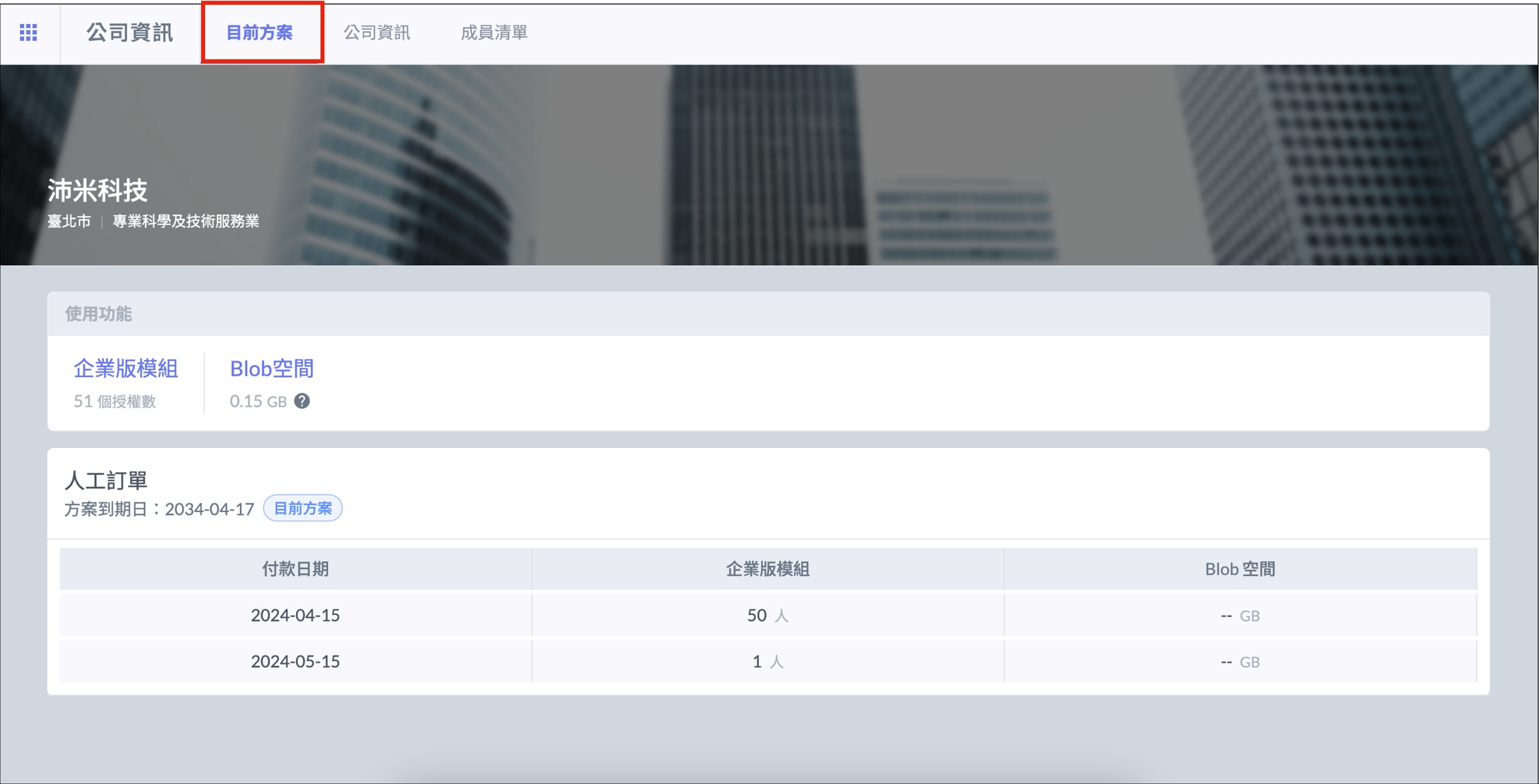目前方案可以查看公司的授權數及 Blob 空間,以及方案到期日。