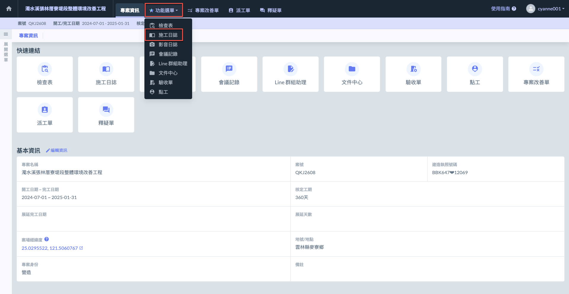若已啟用施工日誌功能，您可&#x65BC;**「快速連結」**&#x6216;**「功能選單」**&#x9EDE;選進入施工日誌。