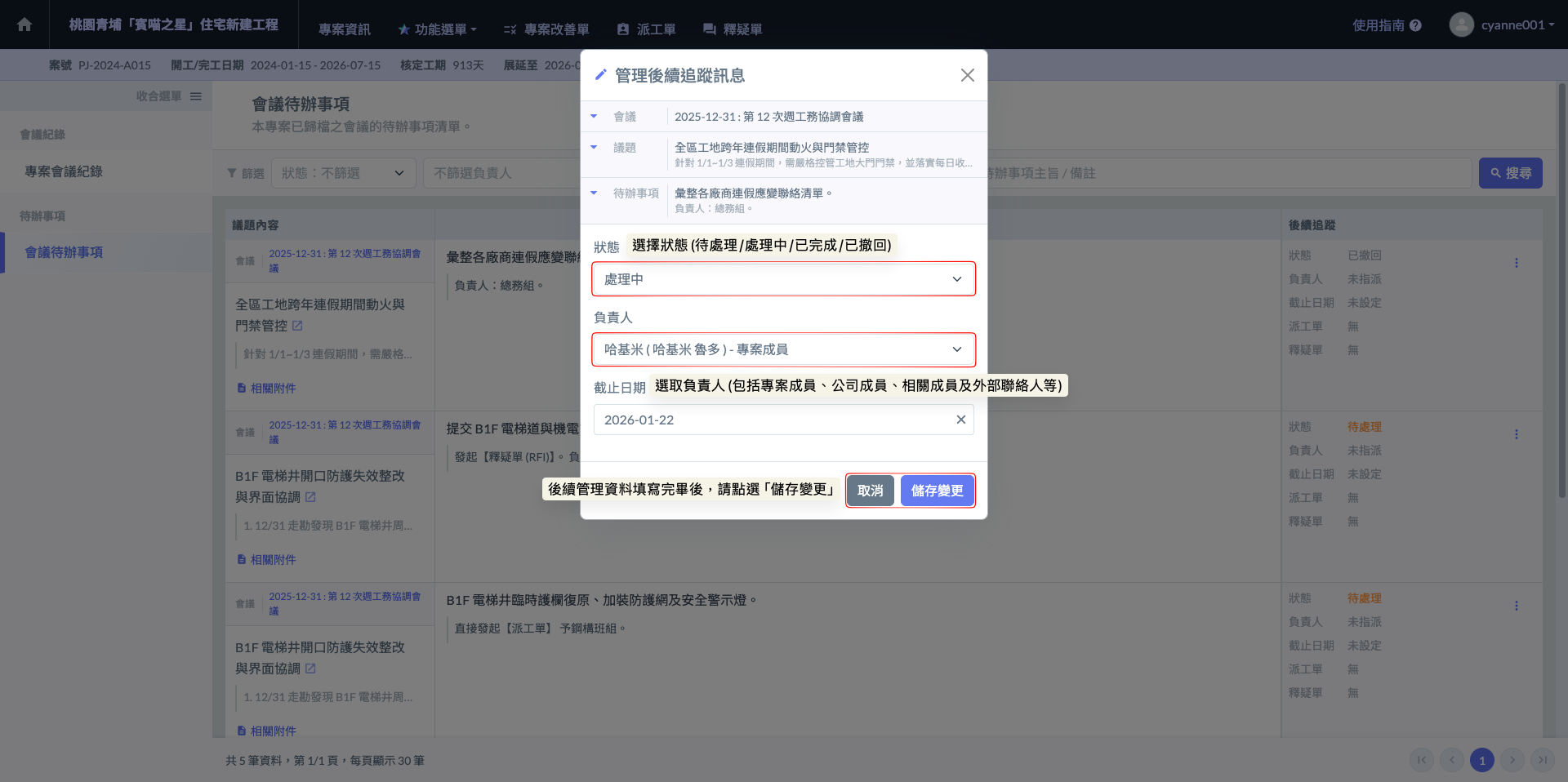 填寫後續追蹤管理訊息：在此介面中，您可以動態更新該事項的『狀態』（如：待處理、處理中、已完成及已撤回）、指定『負責人』並設定明確的『截止日期』。透過這些欄位的詳實紀錄，能確保每項會議決議皆有專人負責、時程受控，並能隨時盤點最新執行進度。