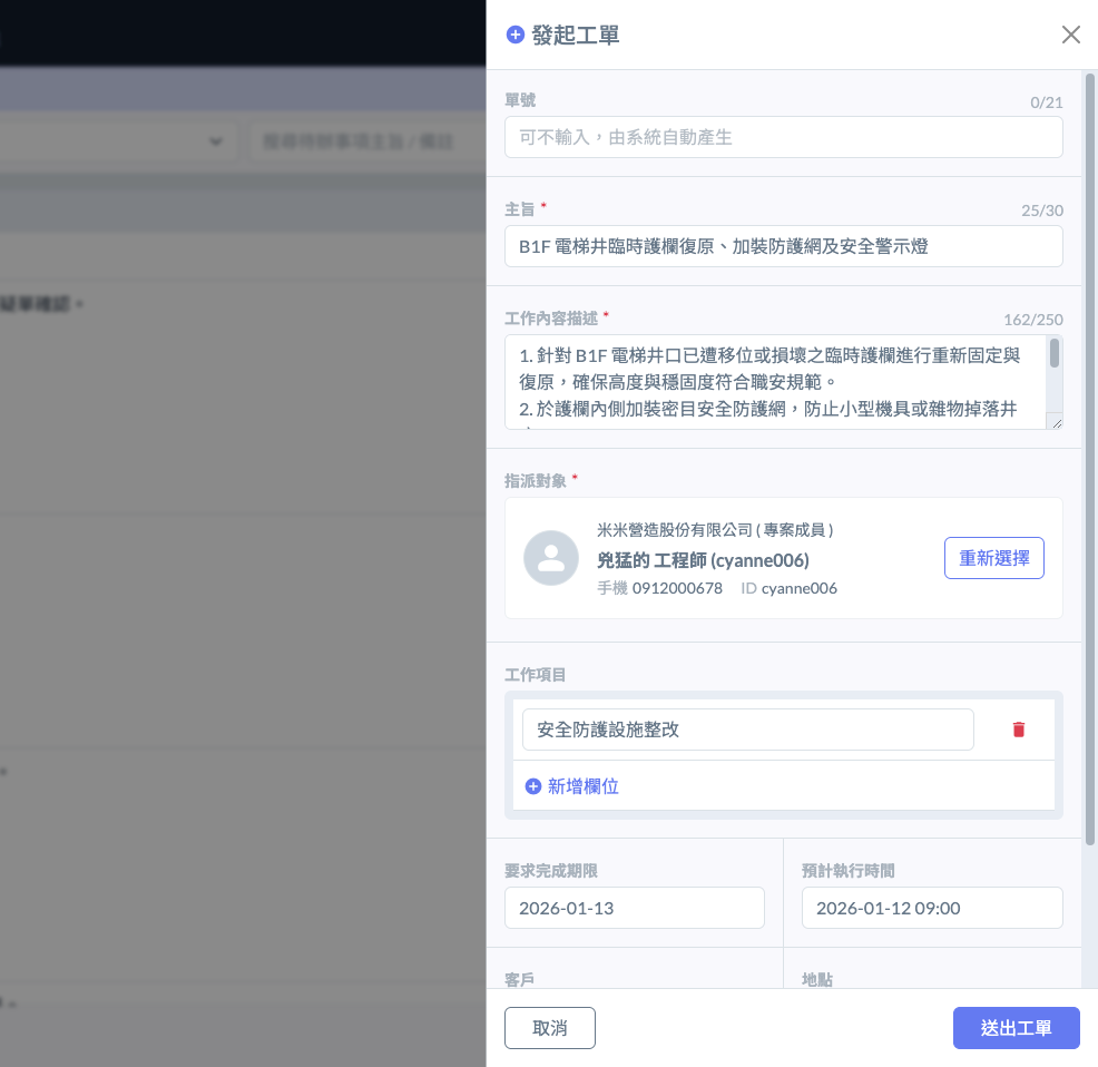 開啟派工單發起頁面後，系統將自動擷取該待辦事項之原始內容，並預先帶入派工單的『主旨』與『工作內容描述』欄位中。您亦可針對特定的施作細節、安全注意事項或對特定廠商的具體要求，進一步編修內容，確保現場執行人員能精確掌握任務重點。