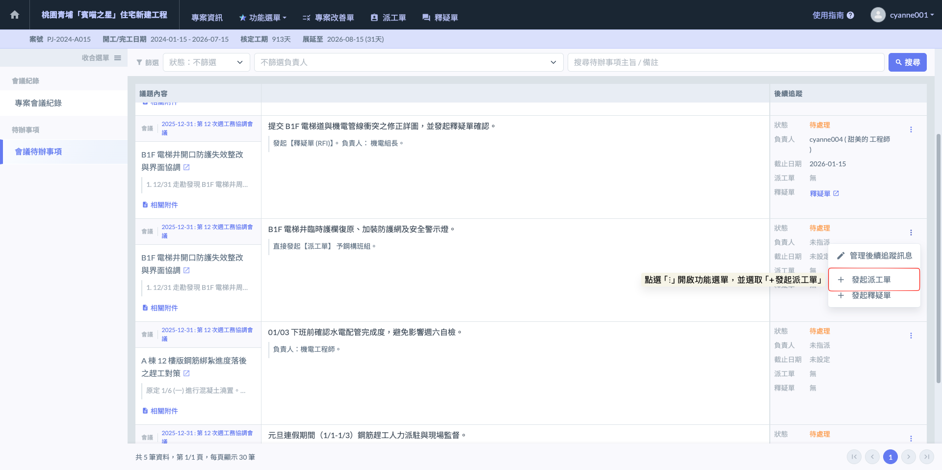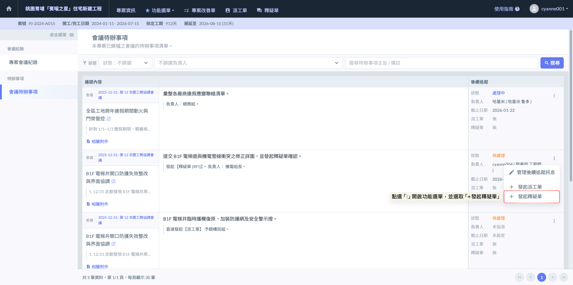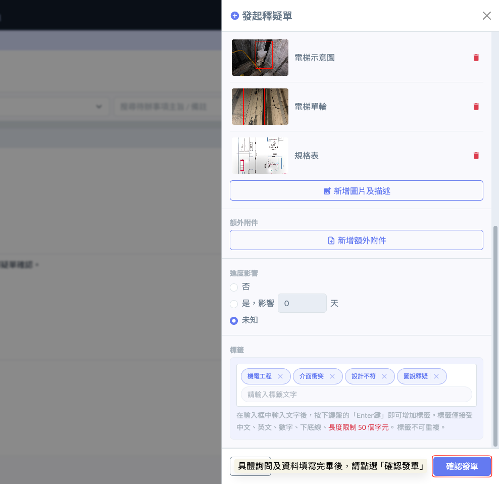 於議題右側的『後續追蹤』欄位，點選『⋮』圖示開啟功能選單，並選取<kbd>**+發起釋疑單**</kbd>。系統將自動連結此會議議題，並開啟釋疑單編輯介面，讓您可以針對如『B1F 電梯道與機電管線衝突』等技術問題，正式向設計或監造單位提出詢問。