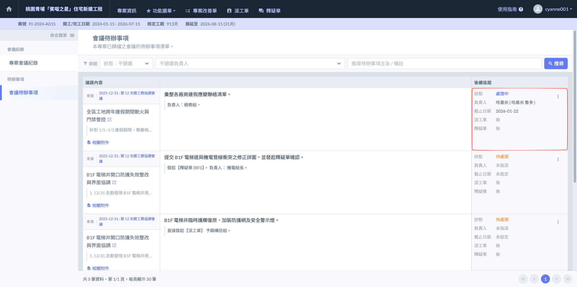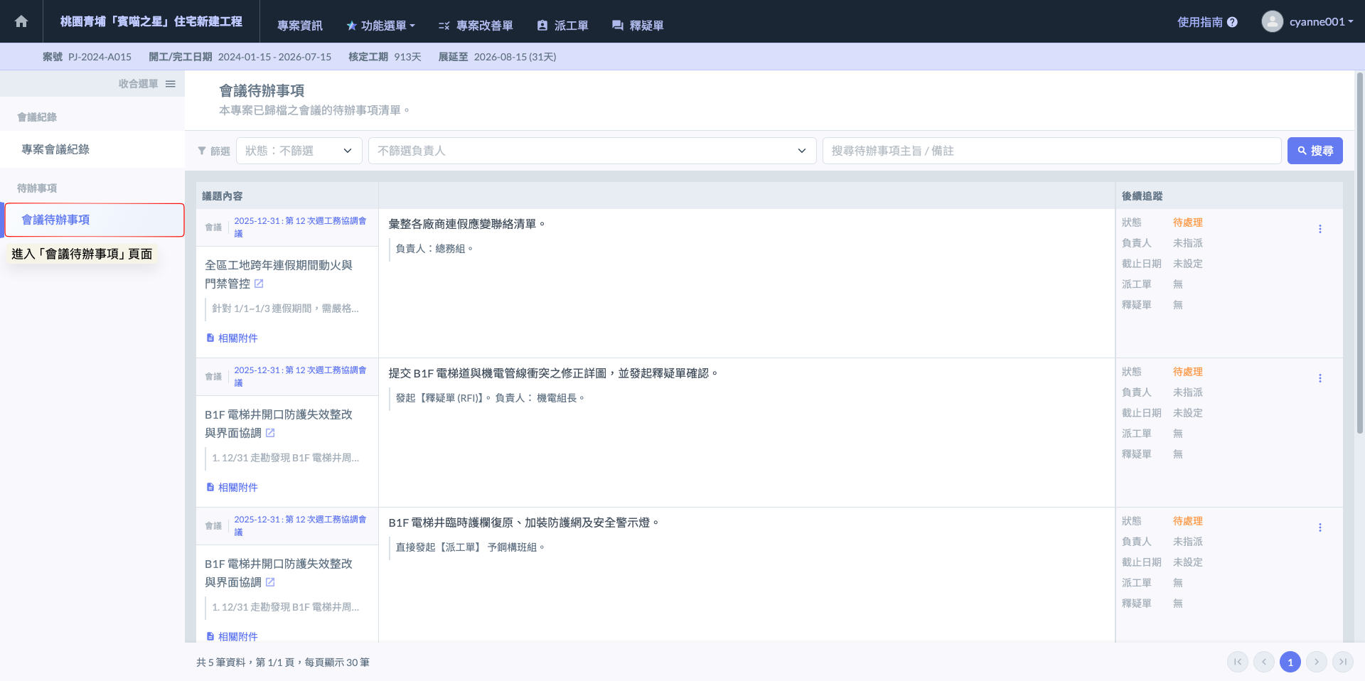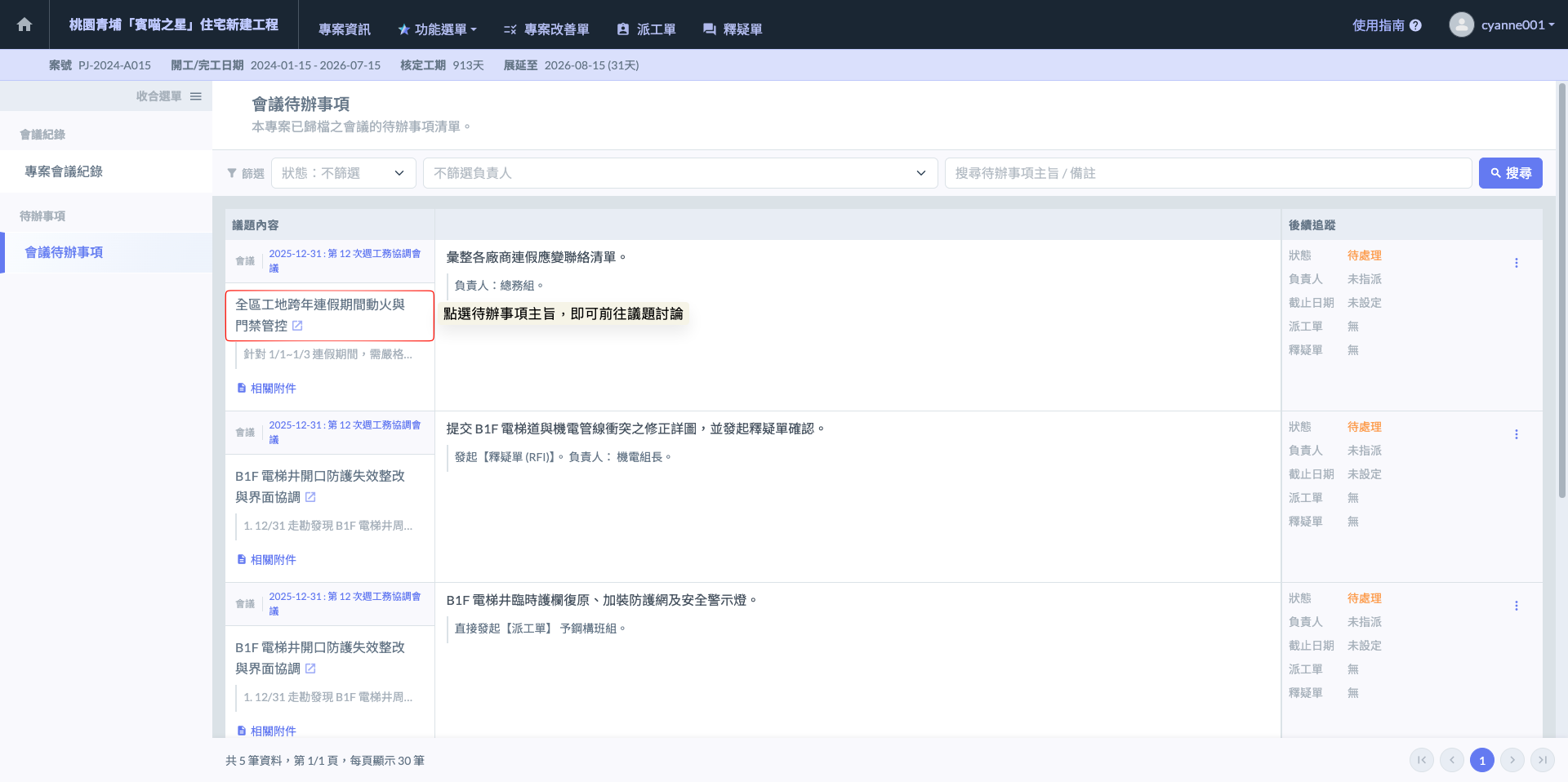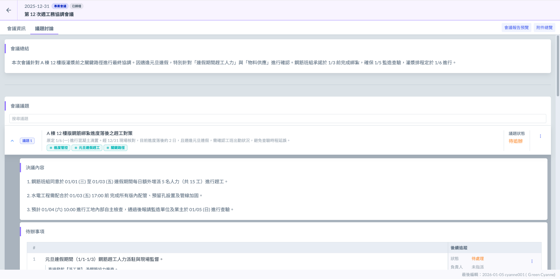在管理大量待辦事項時，善用「會議主旨」的超連結功能，能省去您回到列表重新搜尋會議的時間。建議在確認「釋疑單 (RFI)」內容前，先點回會議內部，確認是否有其他關聯議題會受此圖說更動影響。