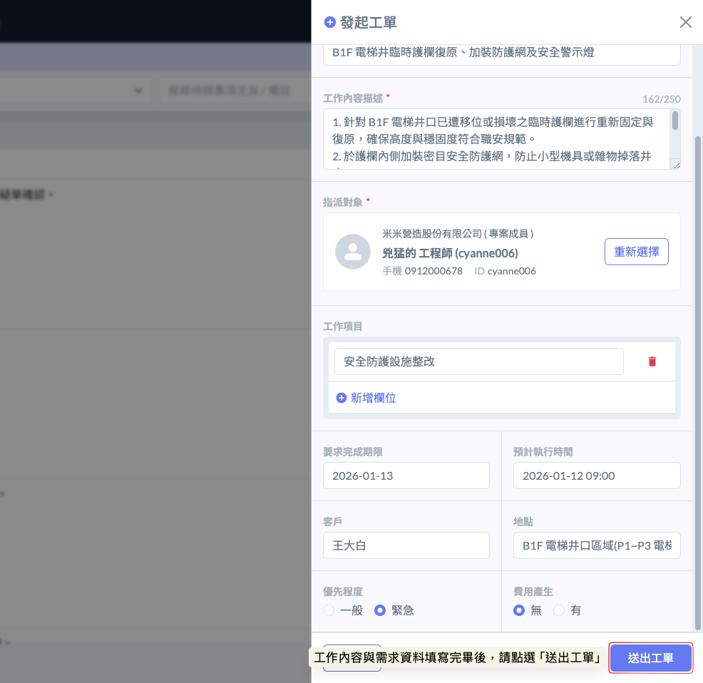<figure><img src="https://2002560121-files.gitbook.io/~/files/v0/b/gitbook-x-prod.appspot.com/o/spaces%2FEqUCL3D5WQfpxJw8NL3P%2Fuploads%2FVdzCO0nr4iClbwMoFhr3%2Fimage.png?alt=media&#x26;token=c335dc16-8103-441f-b180-a997cf7cac90" alt=""><figcaption><p>圖六 - 發起派工單畫面</p></figcaption></figure>
