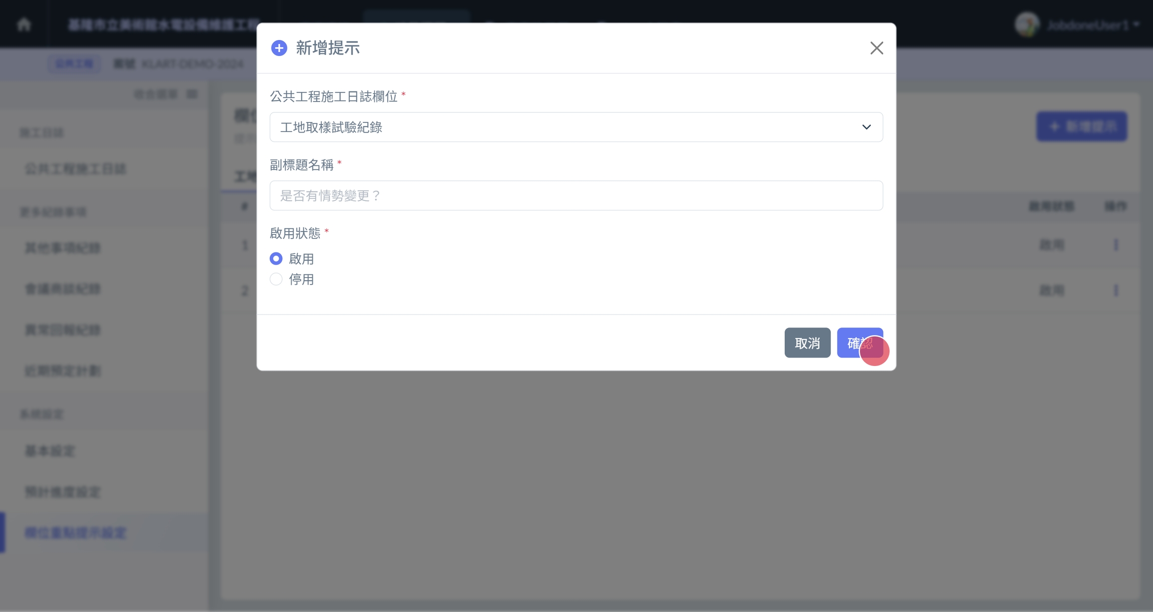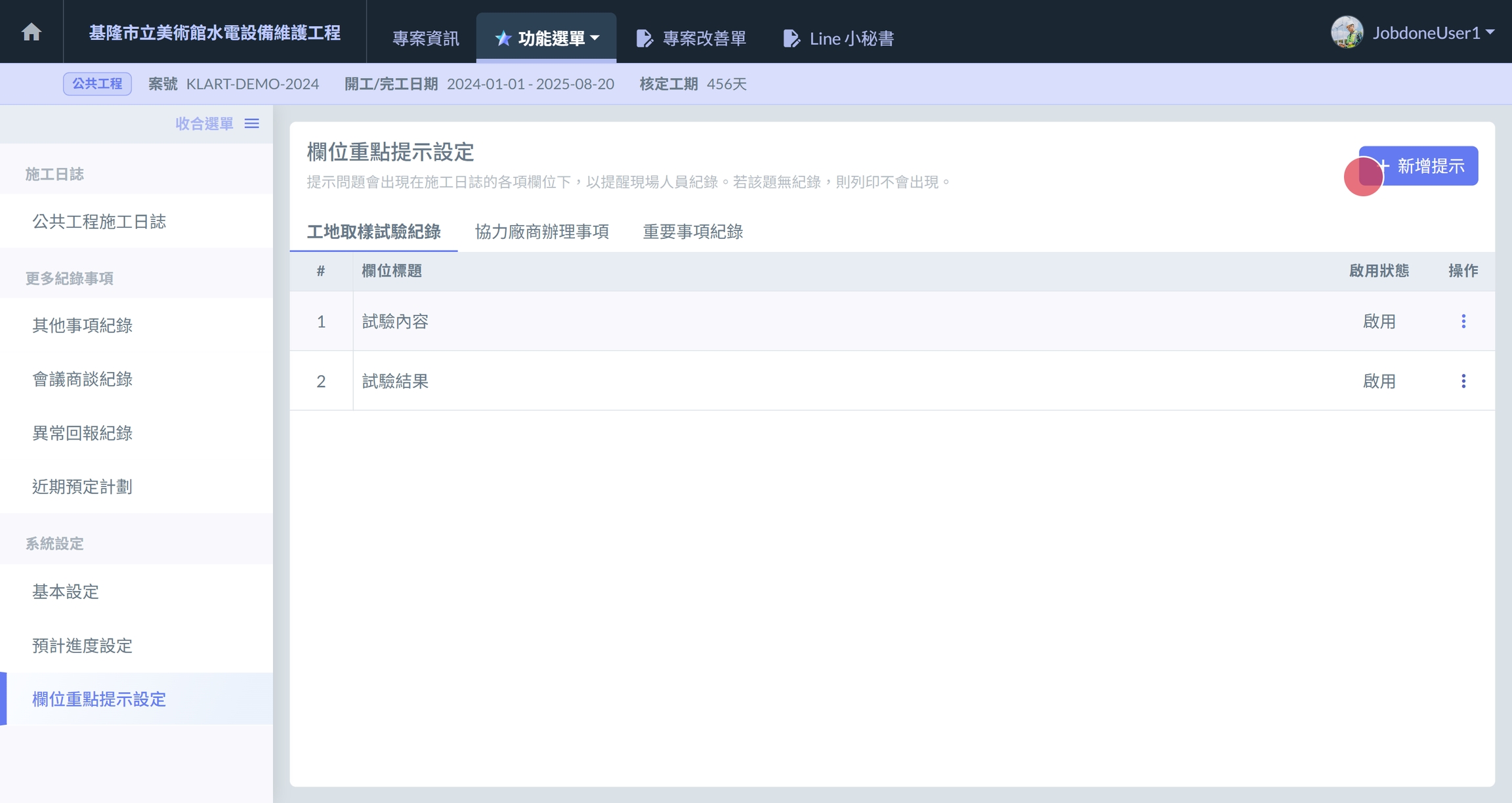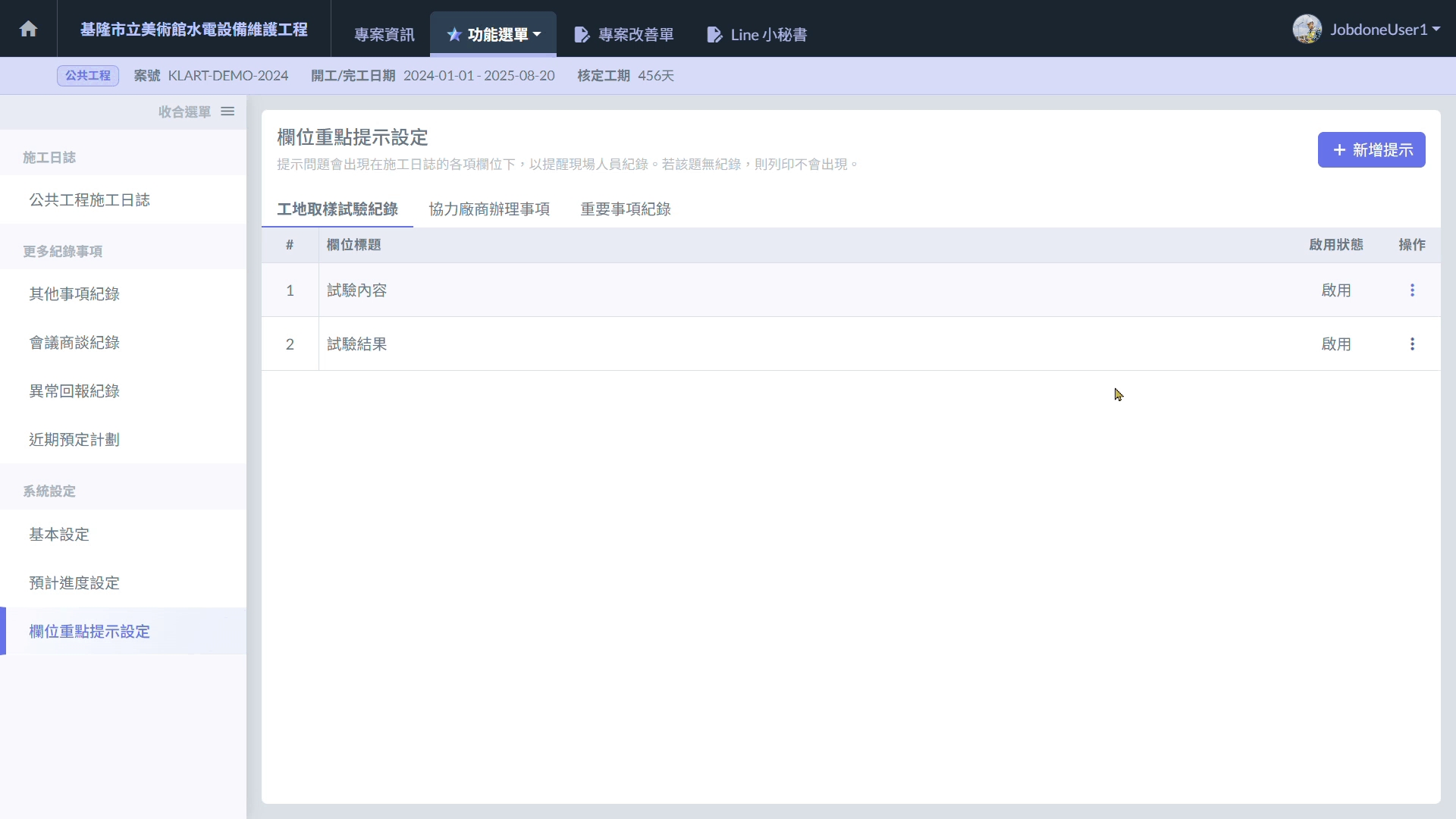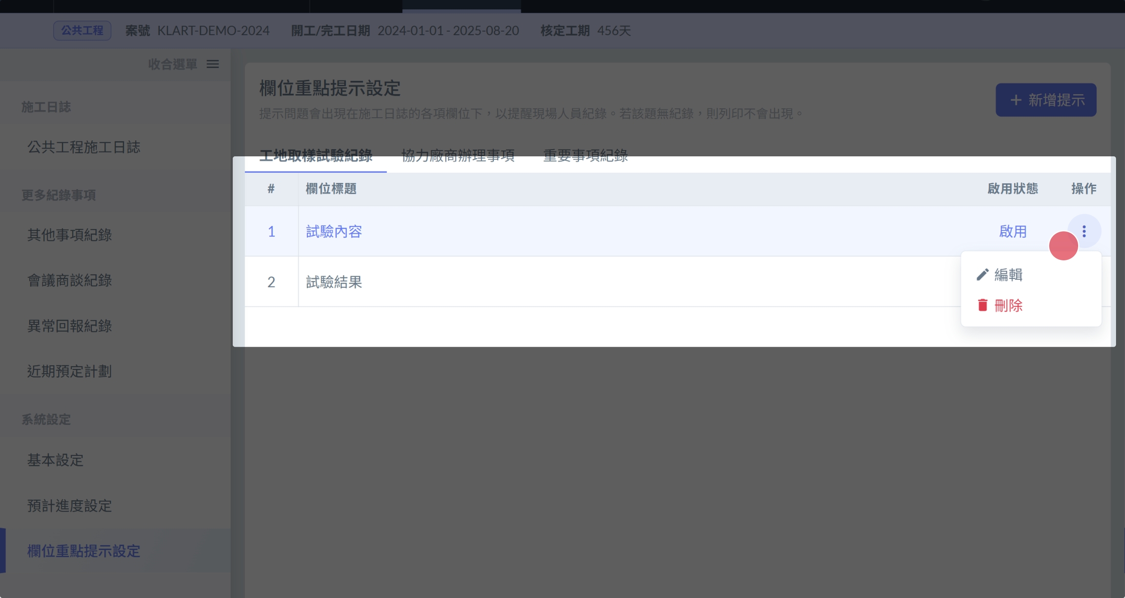 提示問題會出現在施工日誌的各項欄位下,用以提醒現場人員紀錄。若該題無紀錄,則列印不會出現。