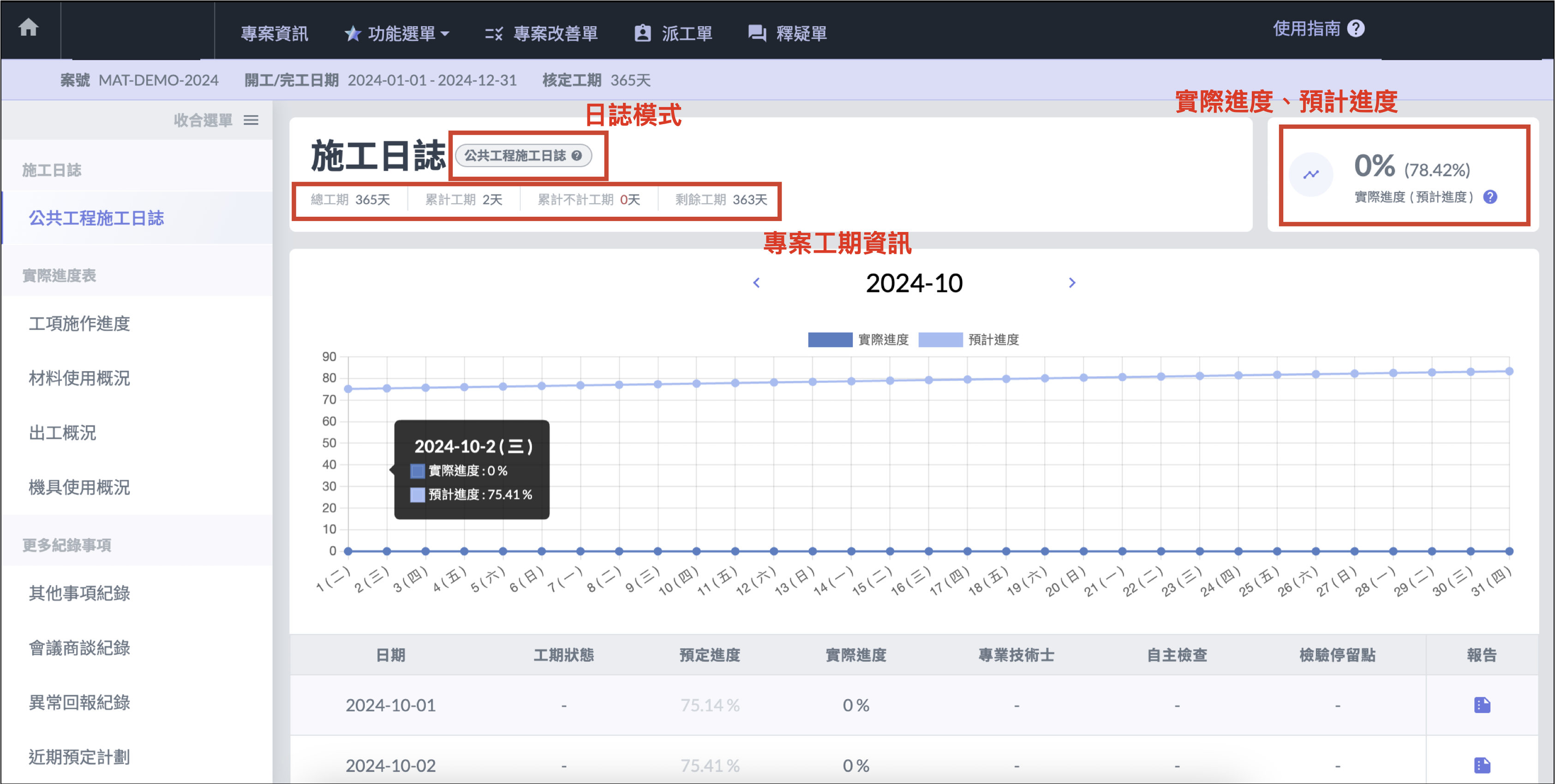 **「 總工期 」** 可在[<mark style="color:purple;">專案設定</mark>](https://docs.jobdone.cc/user_guide/cpm/project_level/basic-information)中設定。「 **累計工期 」**、「 **不計工期 」**、「 **剩餘工期 」** 由系統根據施工日誌填寫的內容進行自動計算。