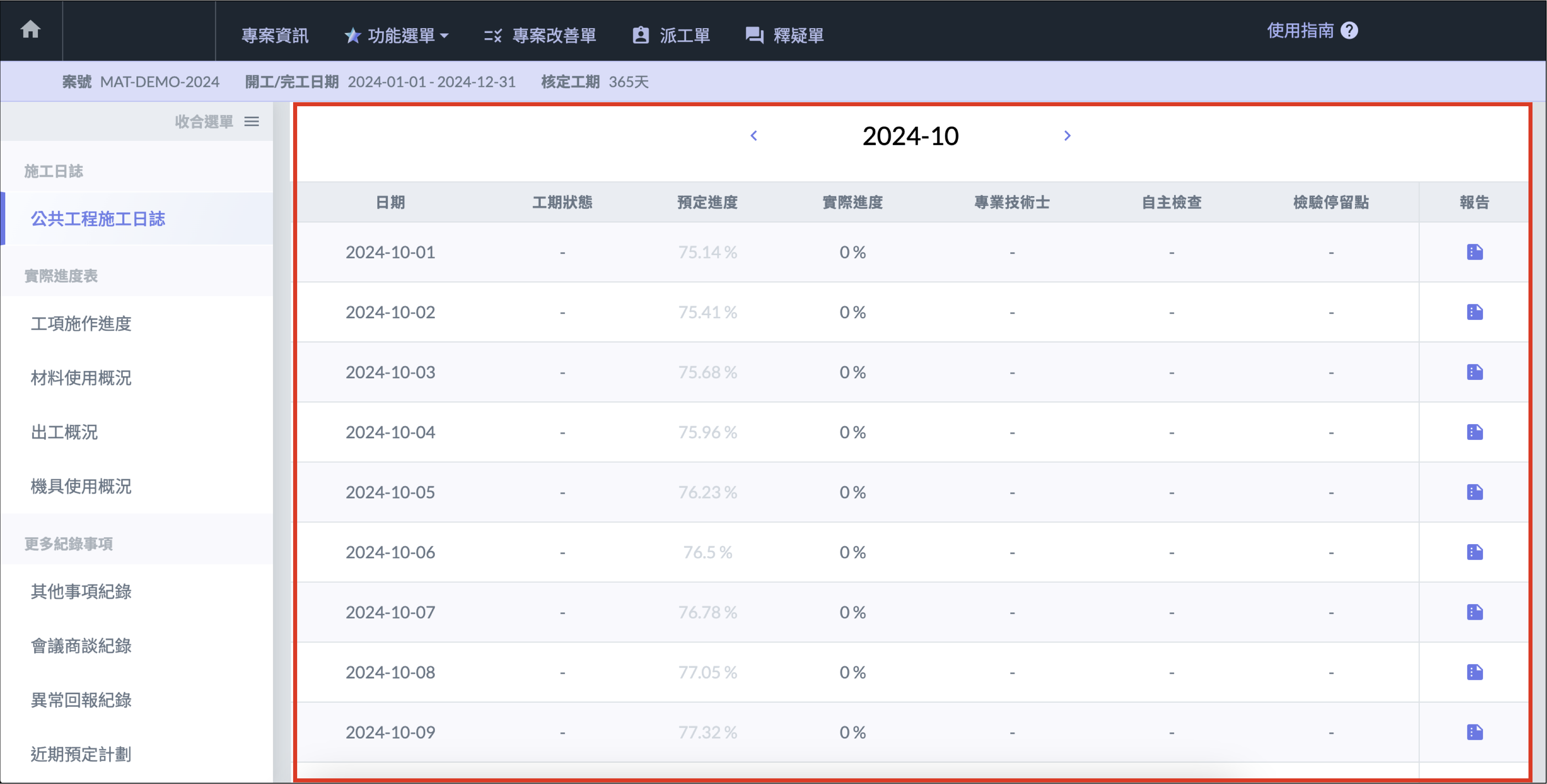 日誌月報可迅速瀏覽每天日誌的填寫概況，也可以點選日期查看指定日期的日誌報告。