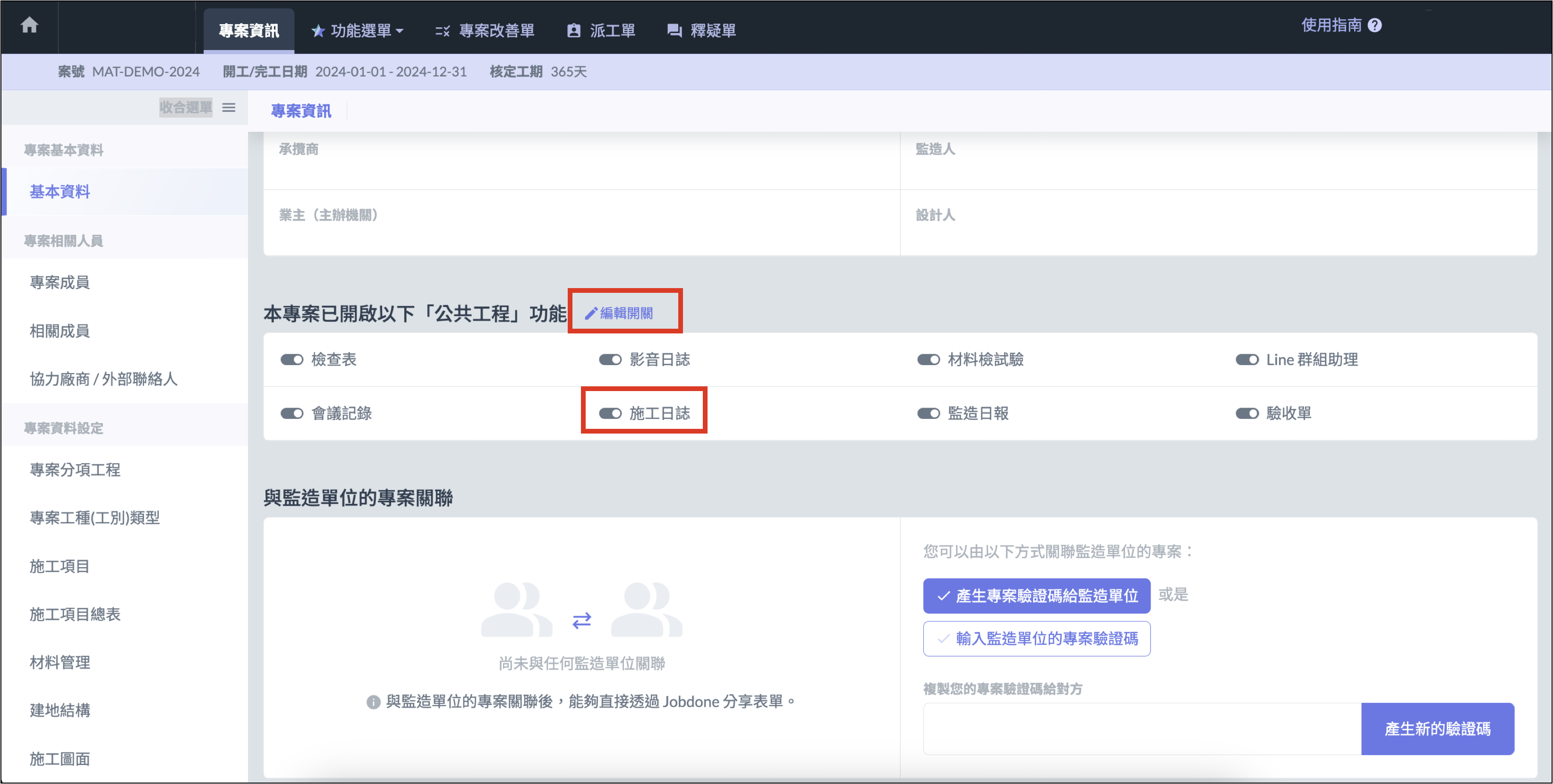 建立專案時，施工日誌功能預設會是啟用狀態，專案經理可開啟或關閉功能。