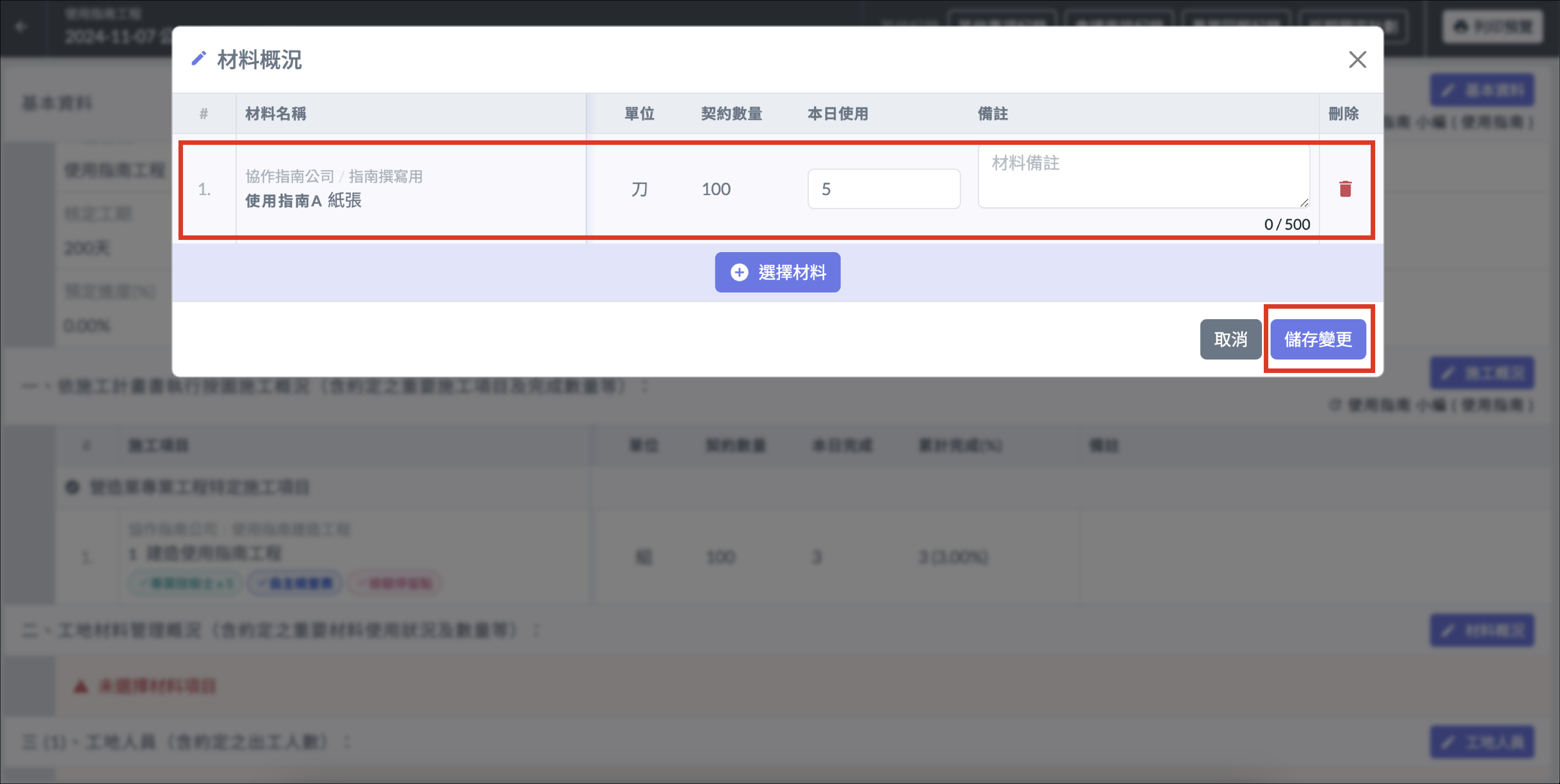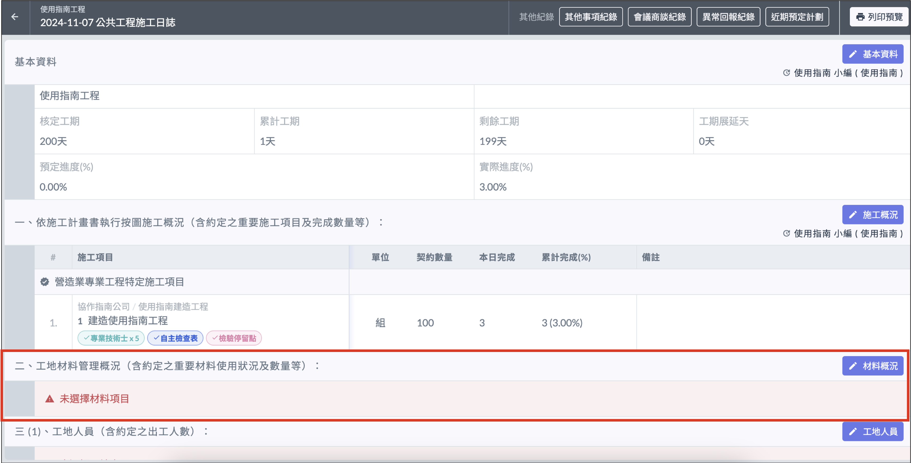 1. 進入施工日誌詳情後，點選 「 材料概況 」。