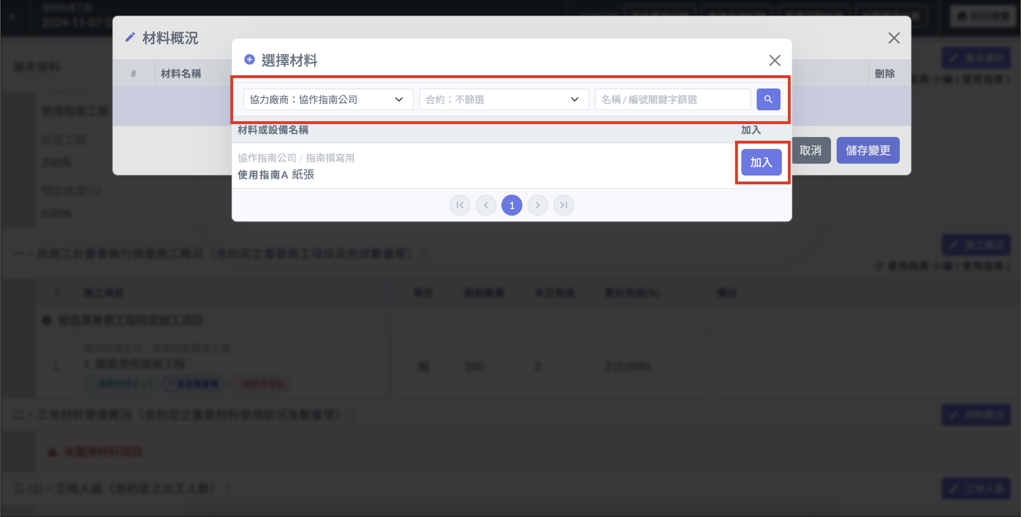 2. 選擇協力公司後，用篩選器根據條件選擇材料（條件設定後要按一下放大鏡按鈕！）