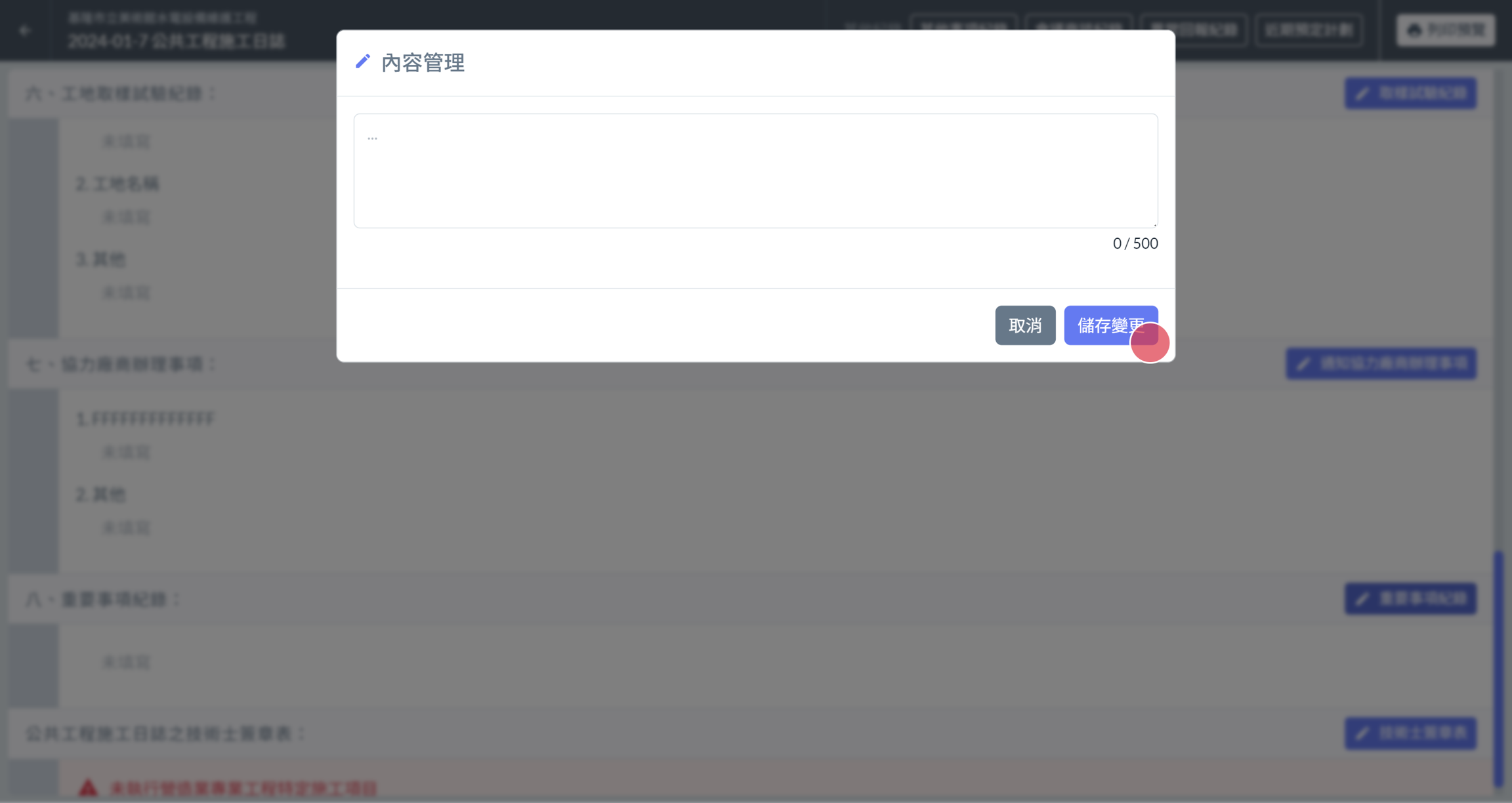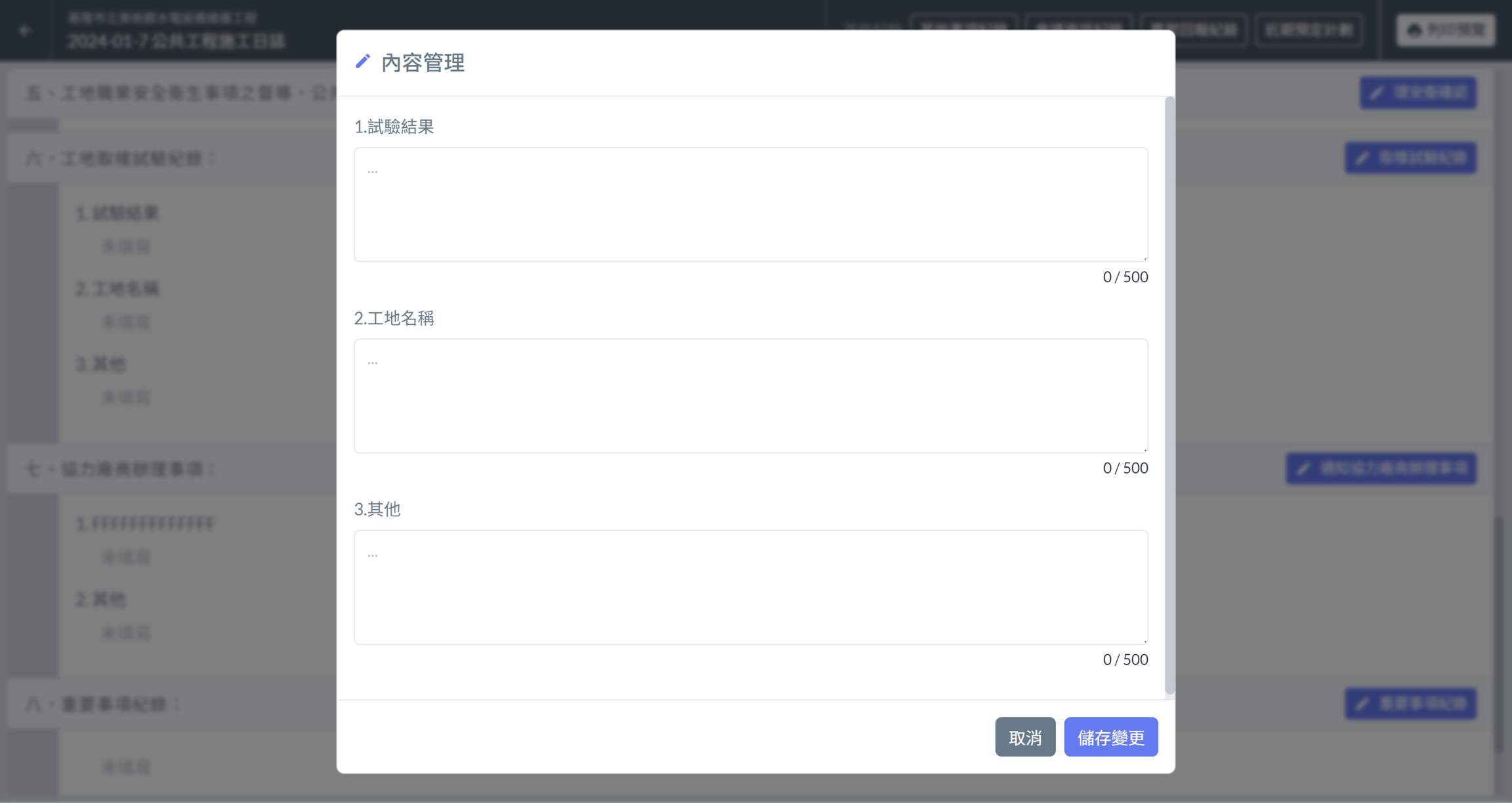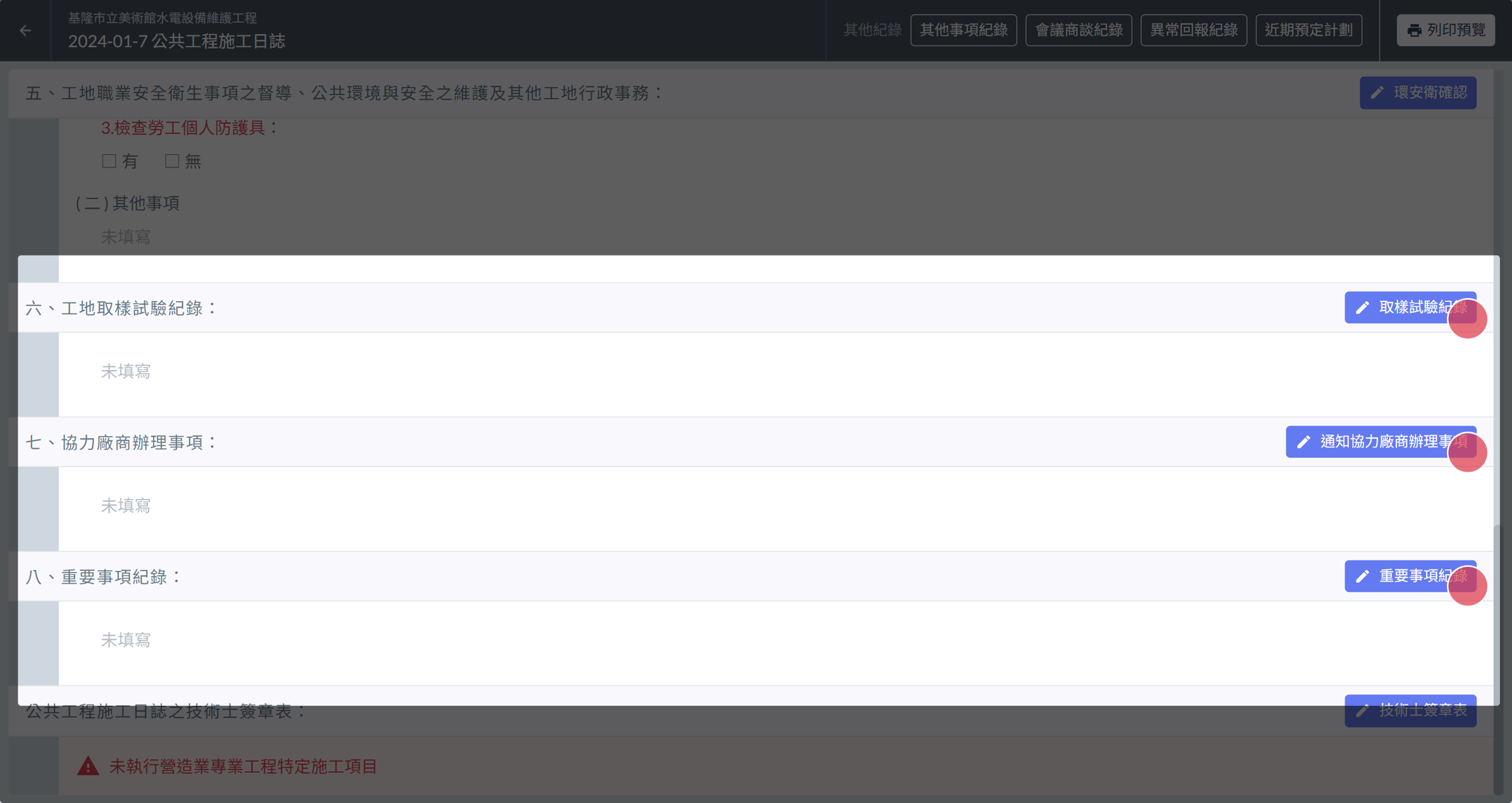 日誌 / 工地取樣試驗紀錄、協力廠商辦理事項、重要事項紀錄