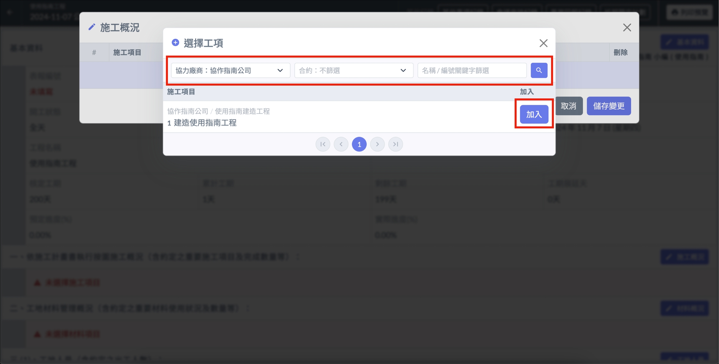選擇協力公司後,用篩選器根據條件選擇工項(條件設定後要按一下放大鏡按鈕!)