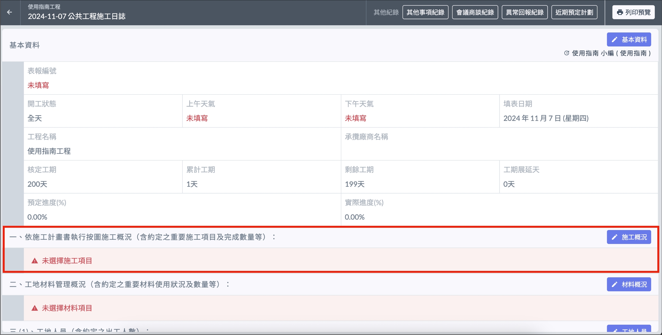 填寫日誌其他內容之前,必須先填寫基本資訊。