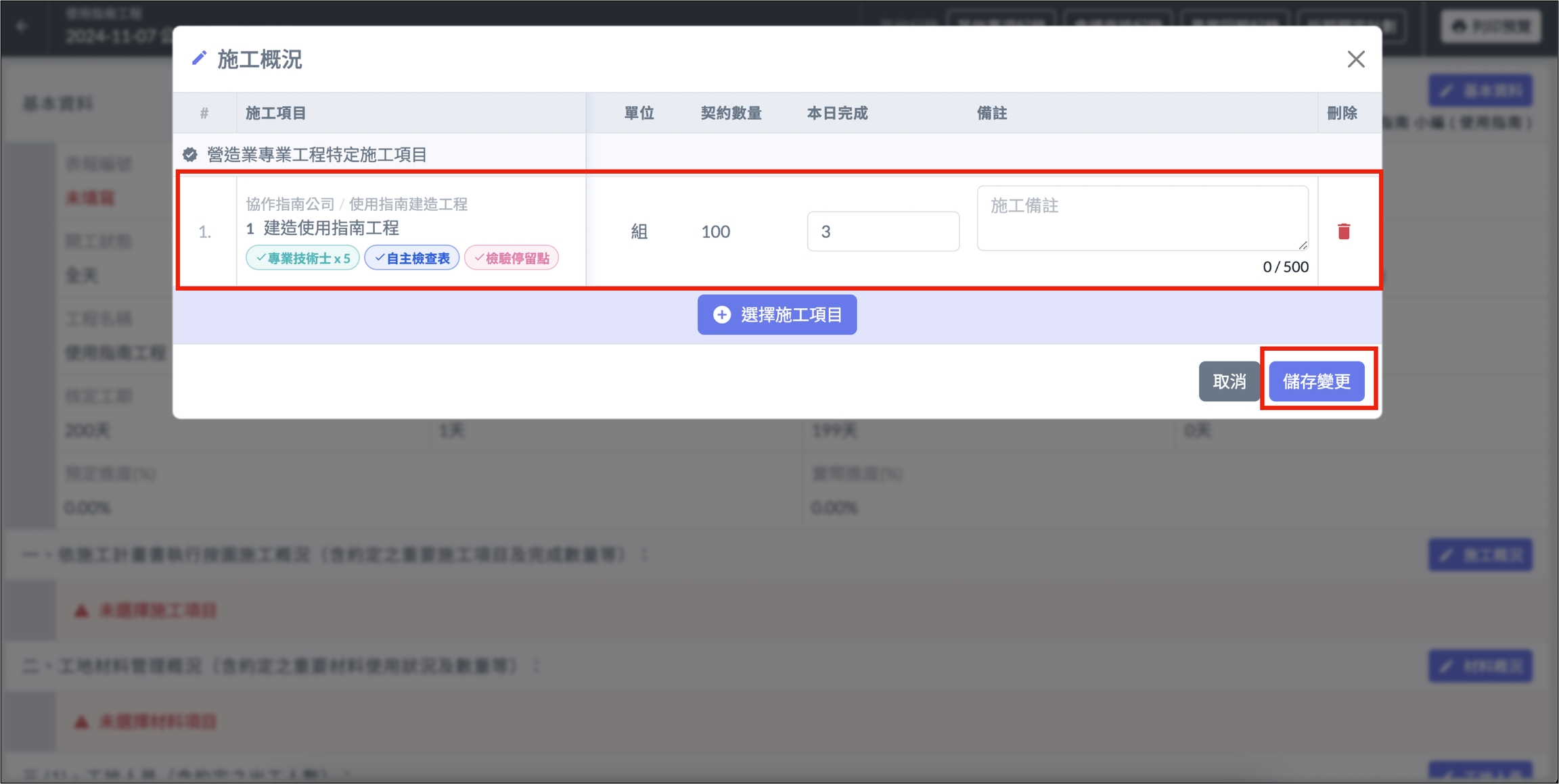 紀錄當日施工項目 、 完成數量 、 備註 的相關資訊。