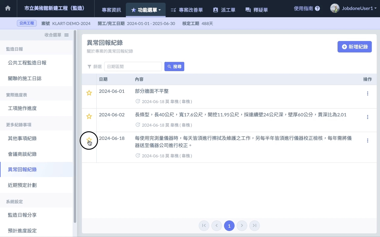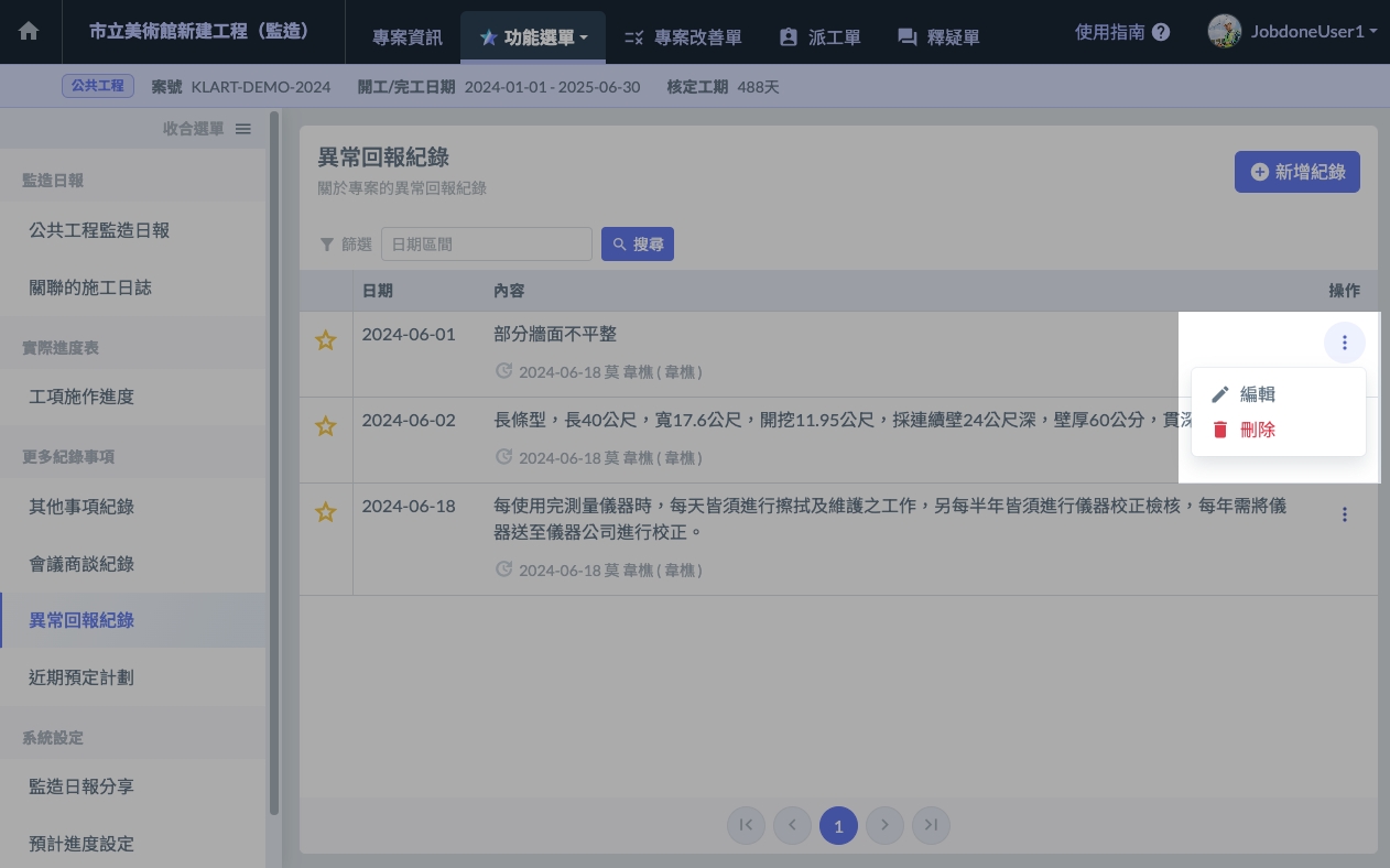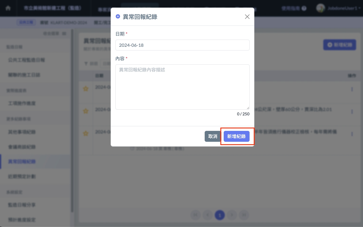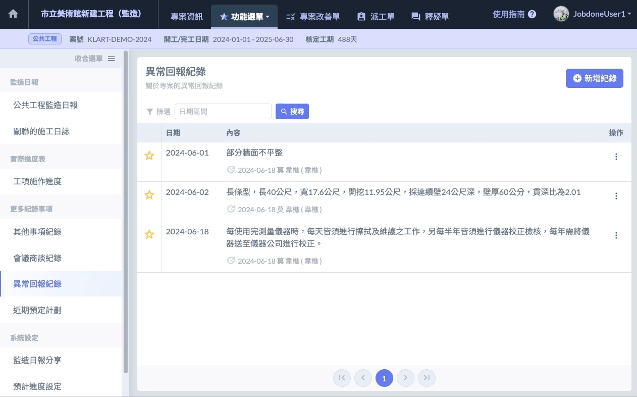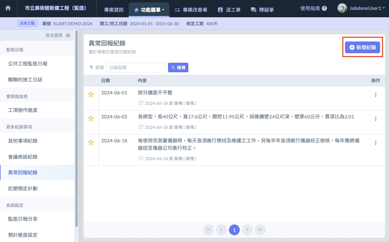 紀錄可於 本頁面進行新增,或從日報當中的 → 日報 / 異常回報紀錄 新增。