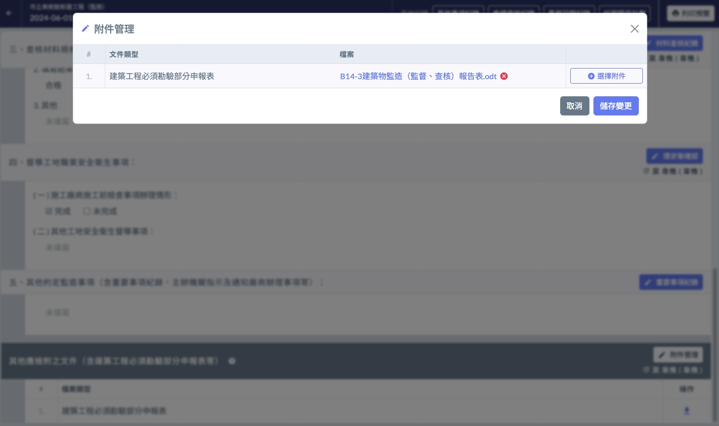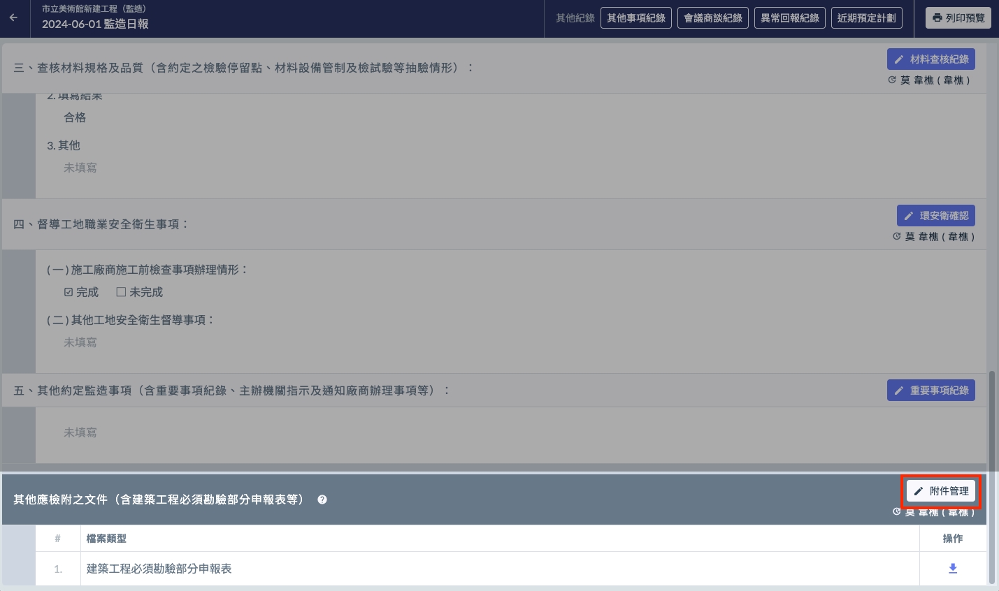 提供上傳監造日報相關文件,並提過「欄位重點提示」的功能,提醒填寫人上傳指定附件。