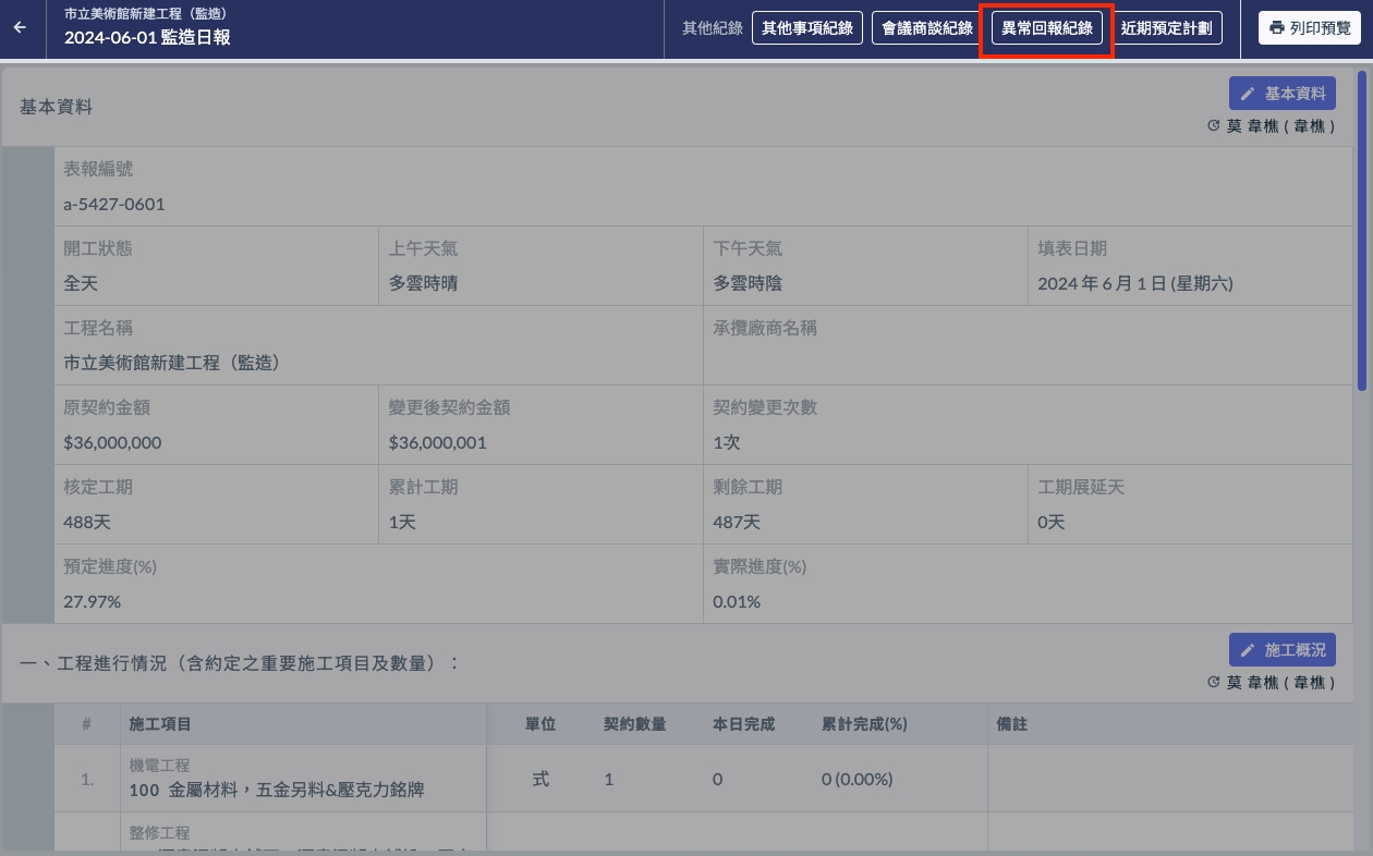 頁面最上方有個 異常回報紀錄 的按鈕(如下圖),點選即可開啟檢視介面。