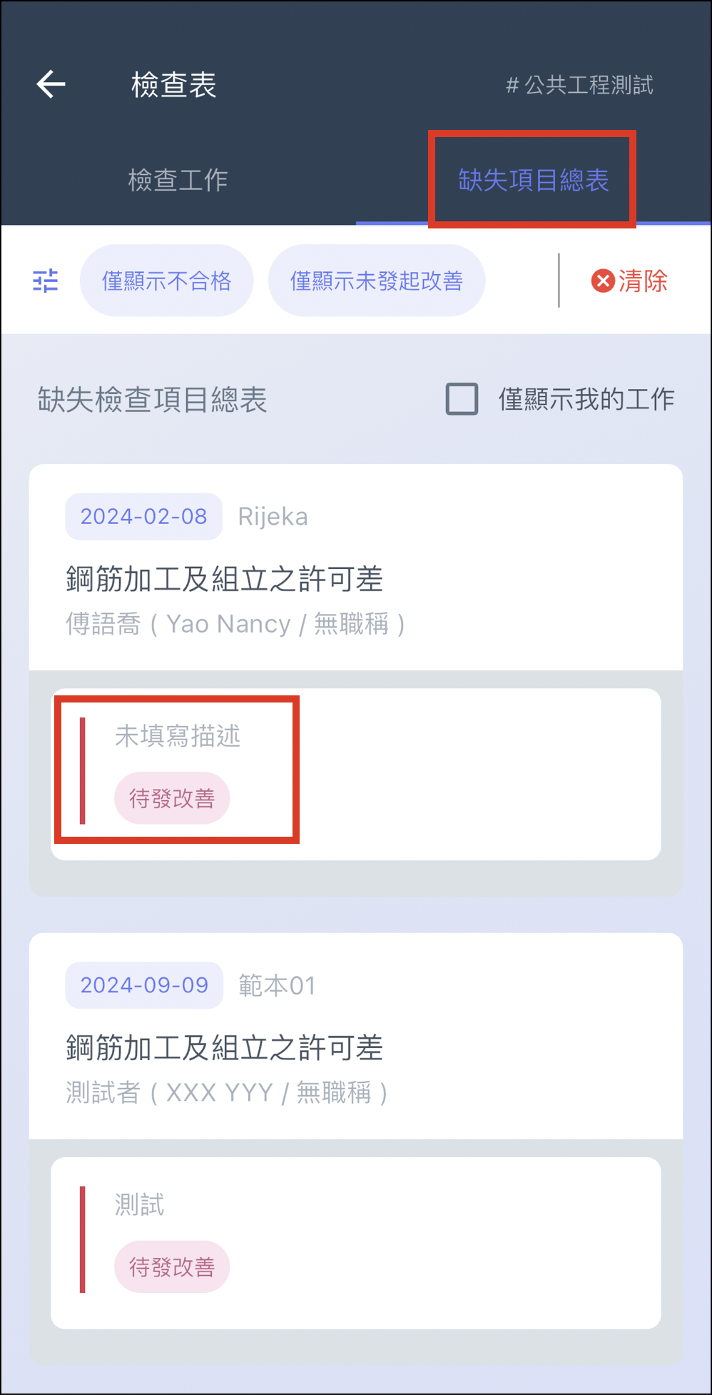 適用情境:執行正式查驗程序(如基樁鋼筋籠檢查、沈澱池規格測量)後,針對判定為『不合格』的項目進行整改追蹤。