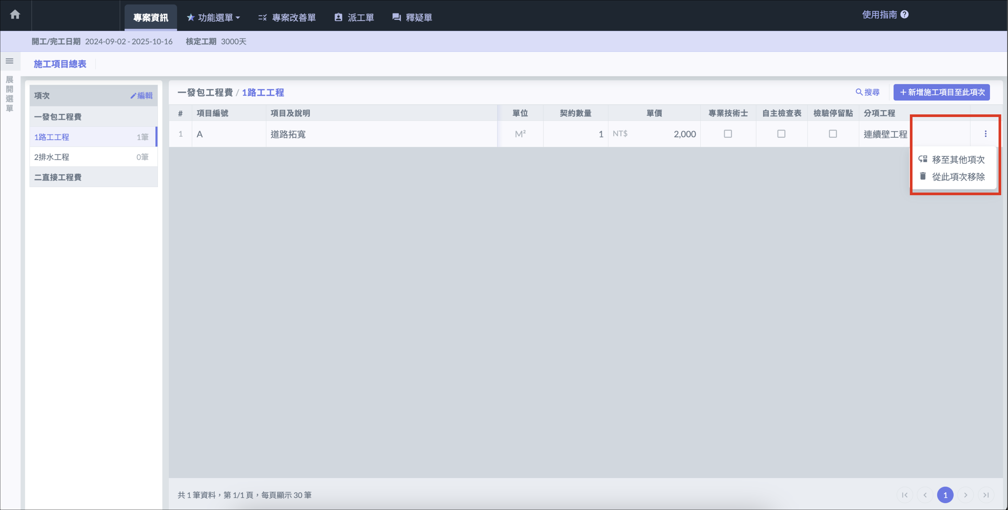 點選施工項目區域,將畫面移到最右側,點擊 「 ⋮ 」 即可移動 / 刪除施工項目。