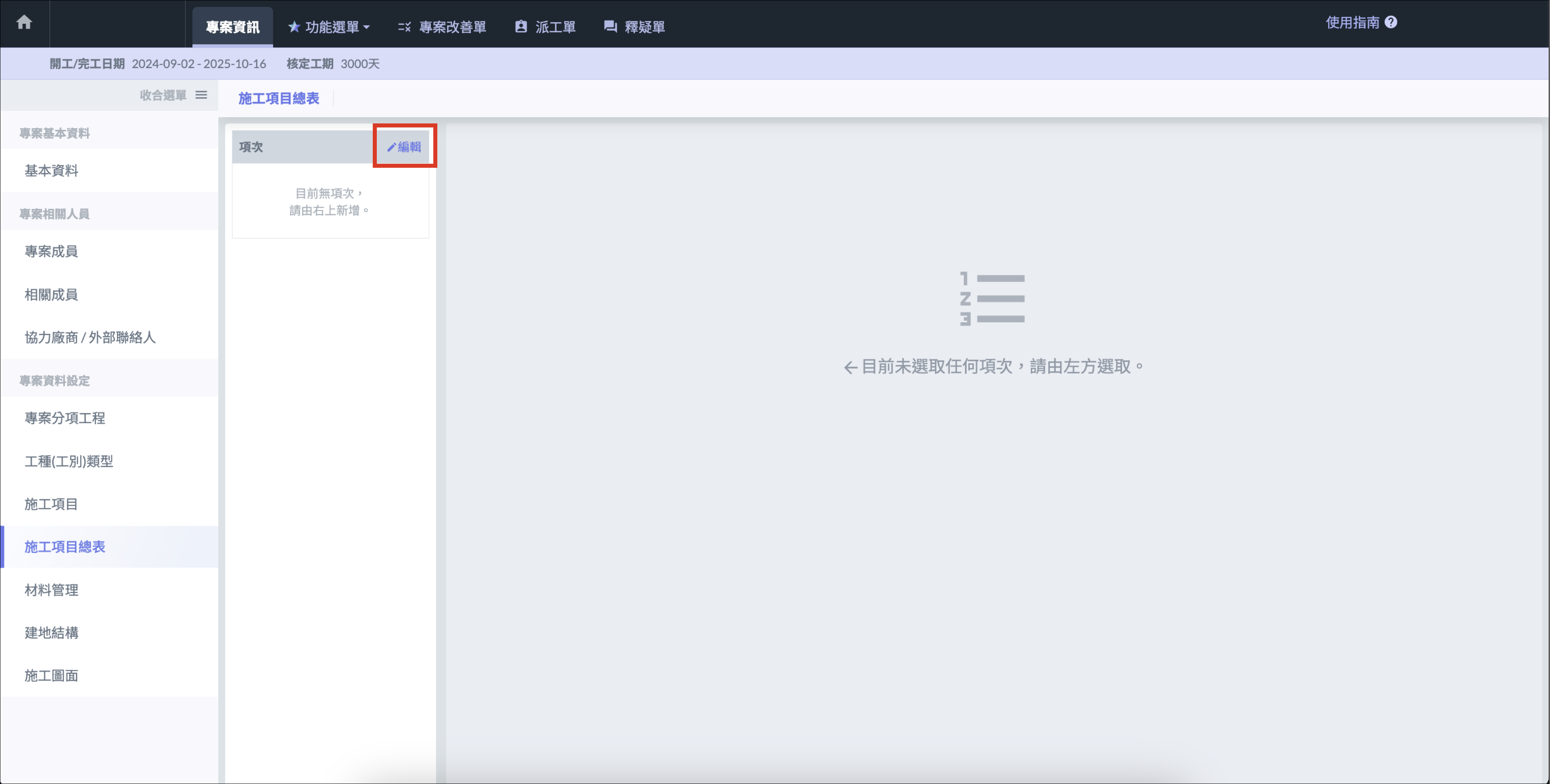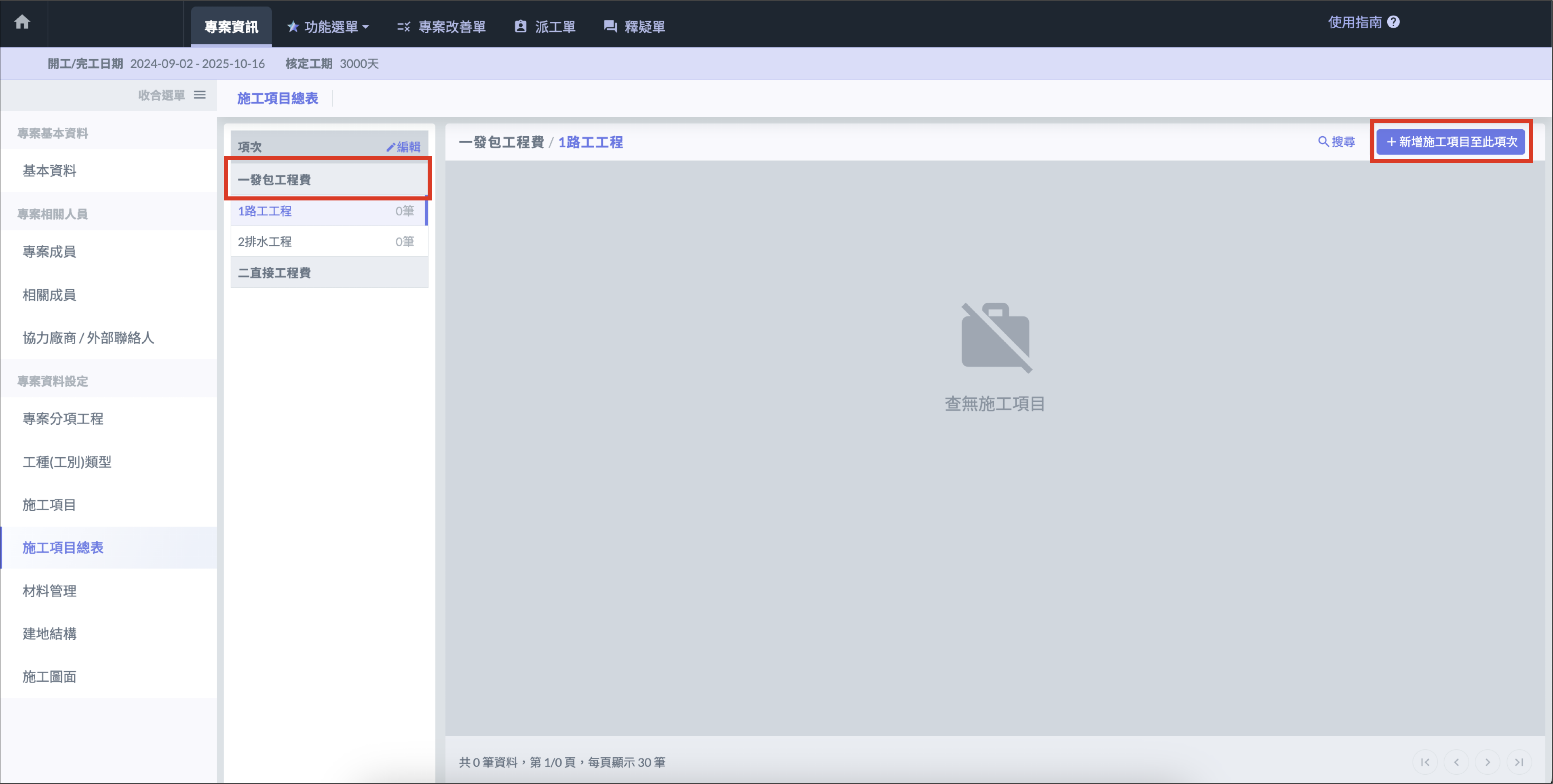 施工項目總表可依據項次及子項次分層管理施工項目,須先完成建立施工項目。