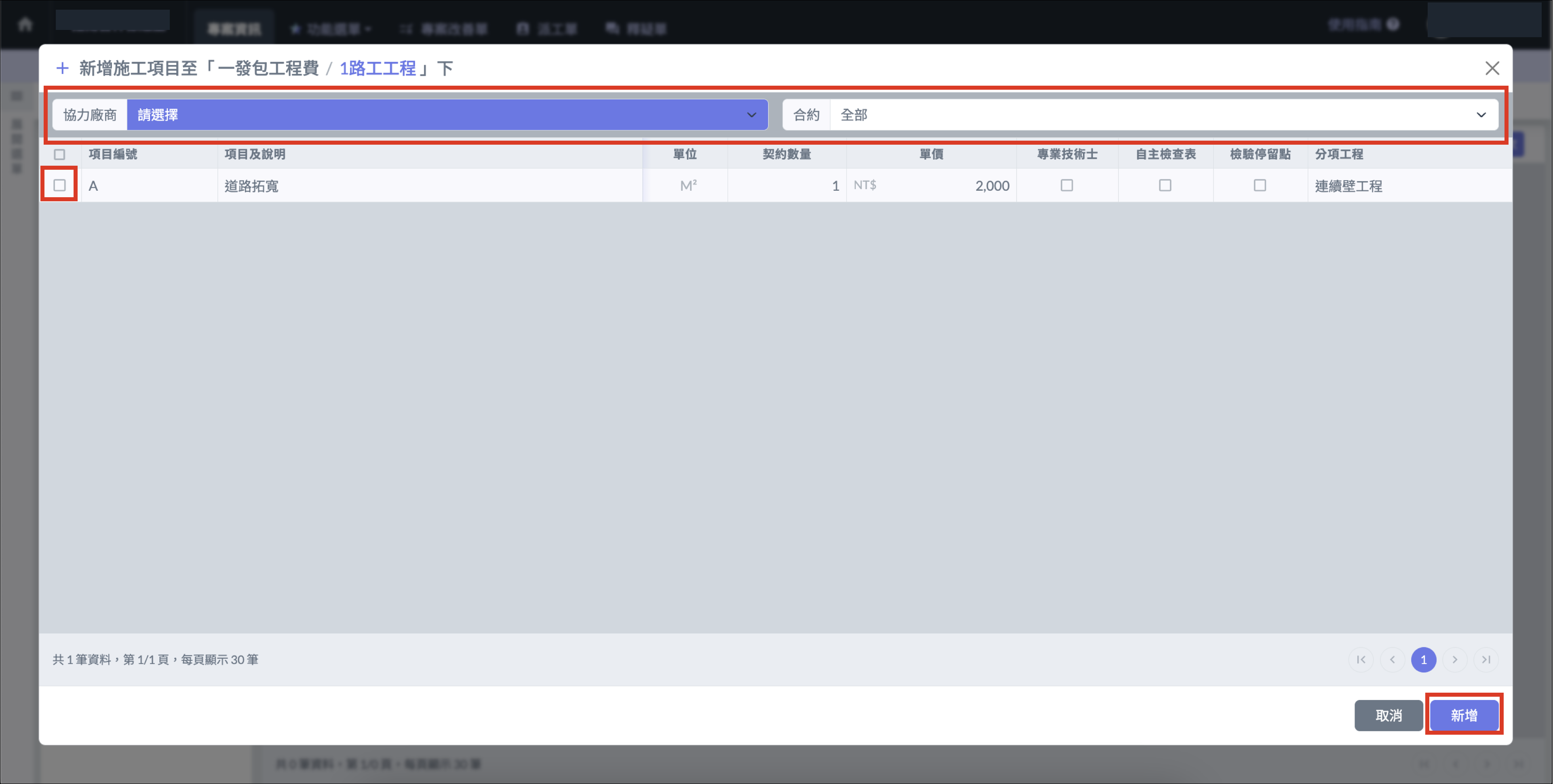 選擇子項次後,點選右上角 「 新增施工項目至此項次 」。使用協力廠商及合約篩選後,即可使用勾選的方式添加一個或多個施工項目。
