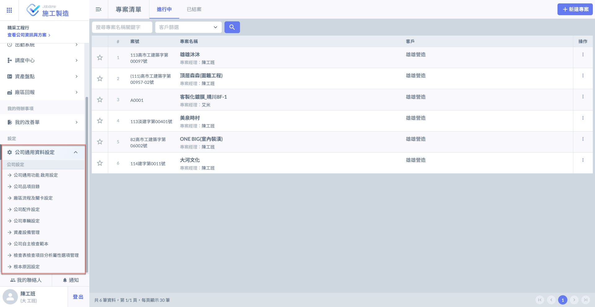 公司通用資料設定涵蓋多項跨專案共用的基本資料，包括服務或產品品項、廠區製程、資產項目、車輛、配件等。這些資料將作為各功能模組中的基礎選項來源，唯有先完成設定，才能在使用相關功能時正確選取對應內容與類別。