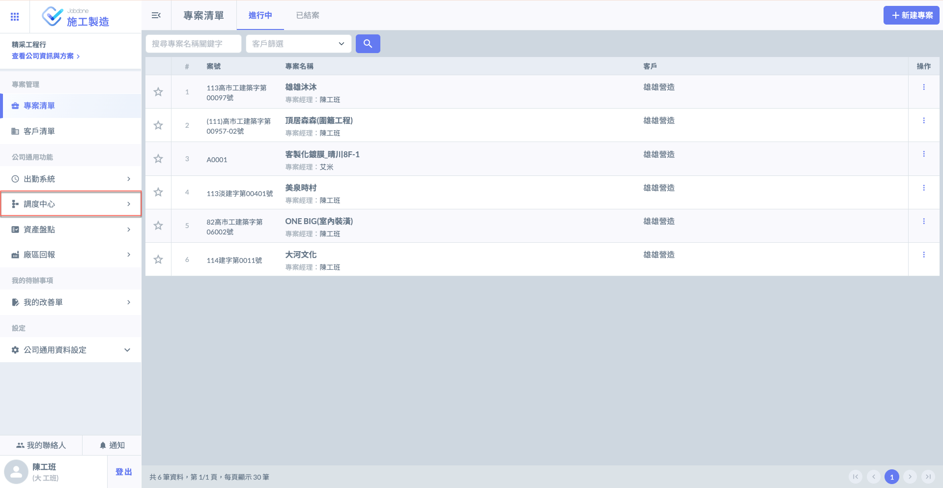 當進入施工製造主頁面後，點選左側的「公司通用功能」欄位中的<kbd>**調度中心**</kbd>，即可進入並使用調度中心功能。