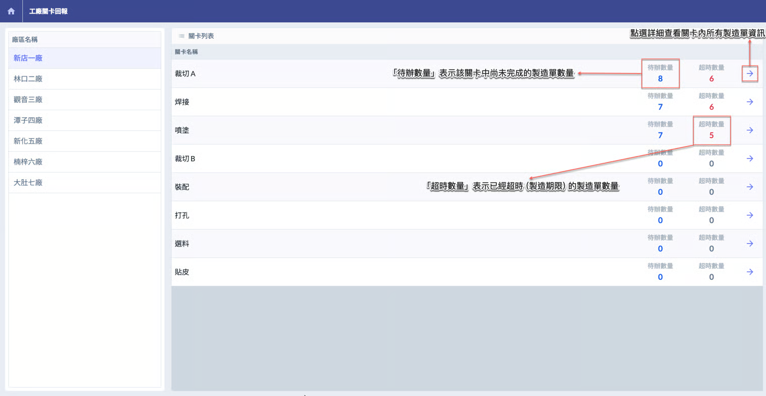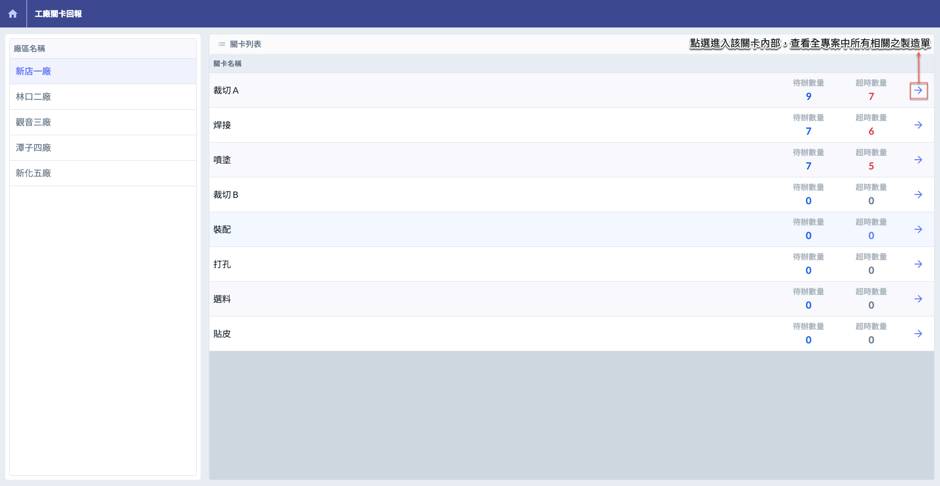 如圖三所示,選取廠區後,即可看到各個關卡目前的待辦數量、超時數量: