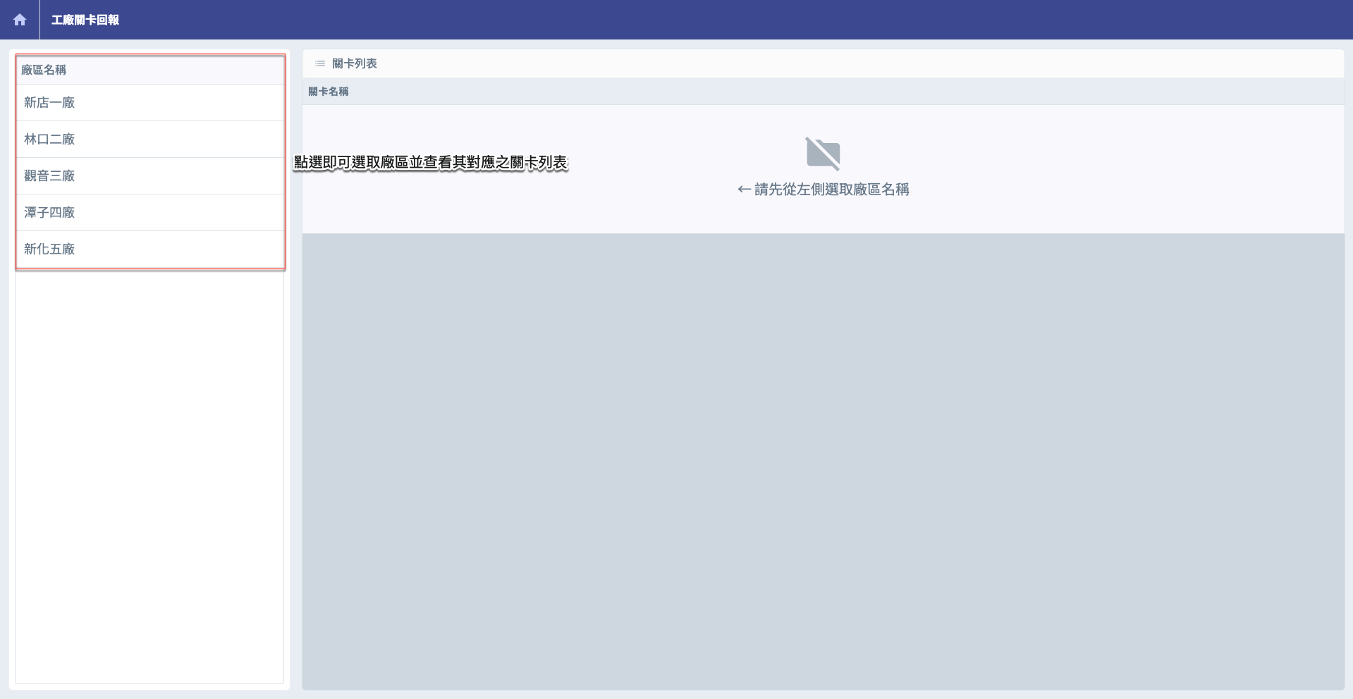 如圖二所示,以選取新店一廠為範例,系統即會顯示其對應的關卡列表。