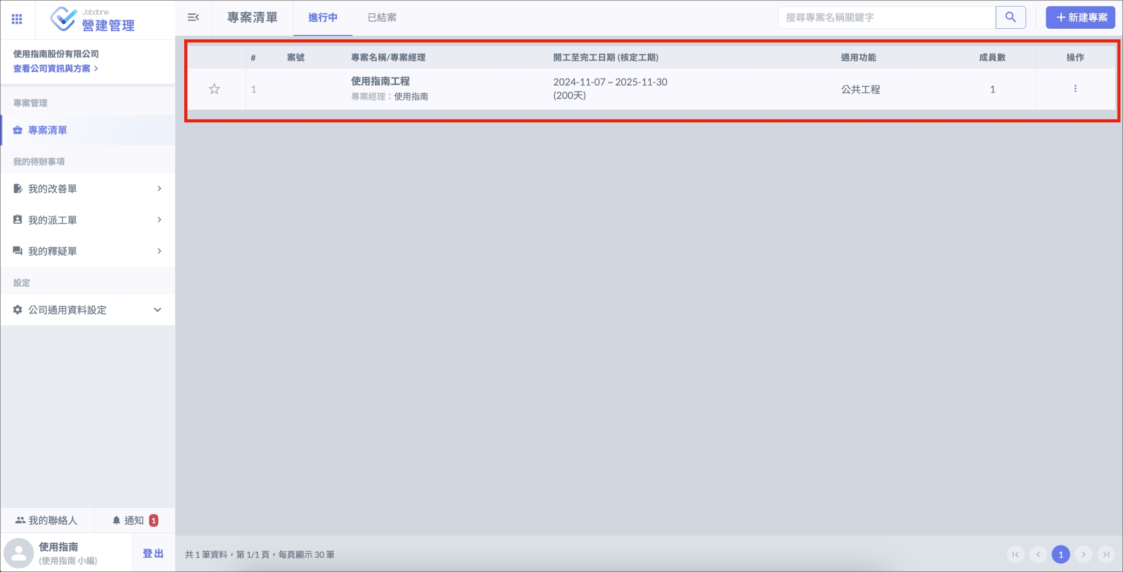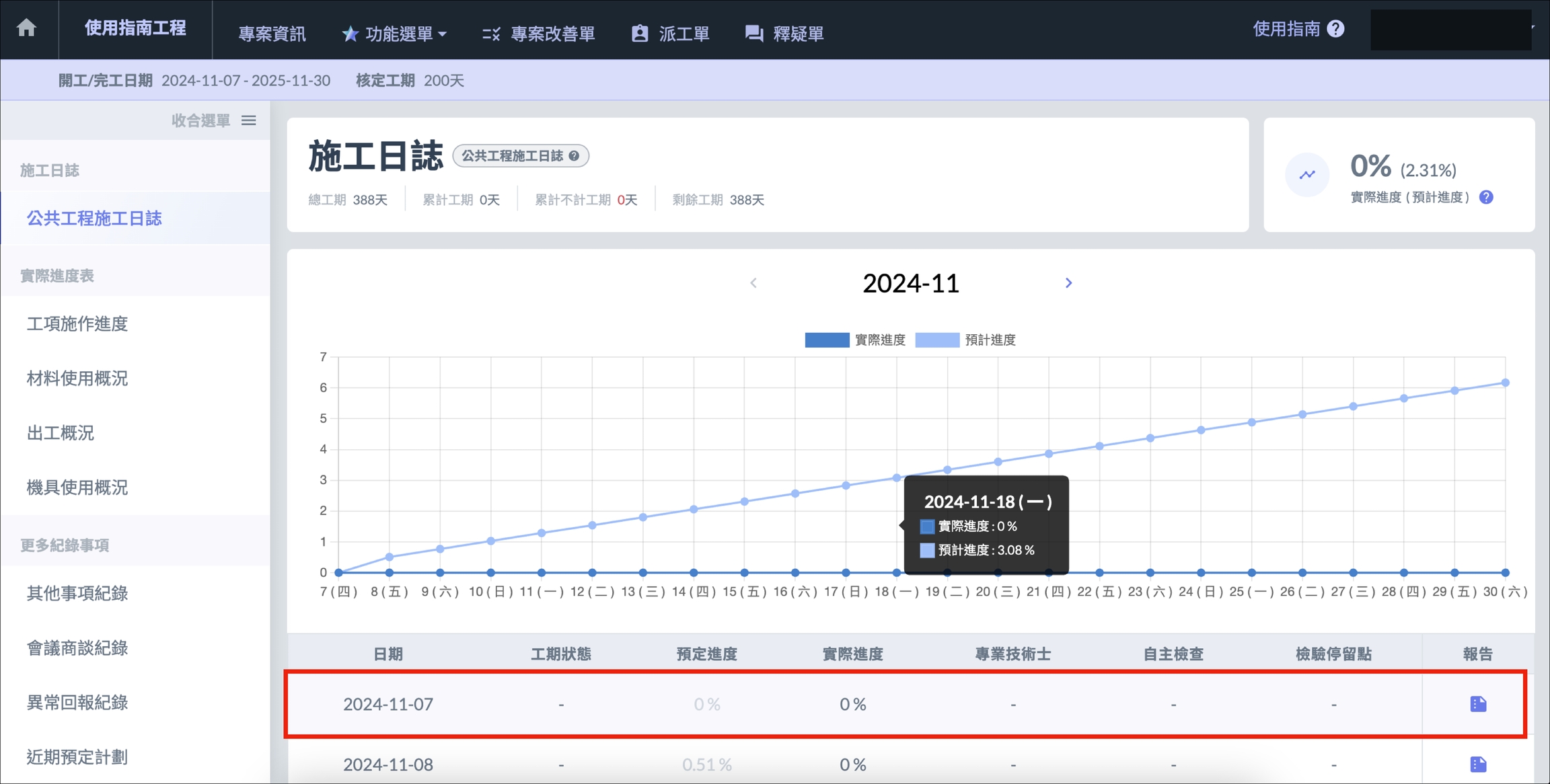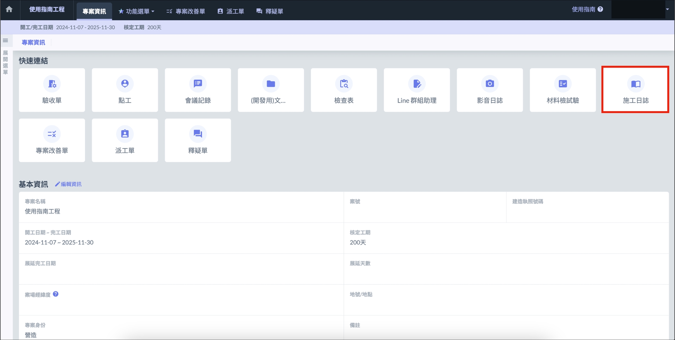 選擇想要建立施工日誌的專案,進入專案介面後點選 「 施工日誌 」,即可進入施工日誌介面。