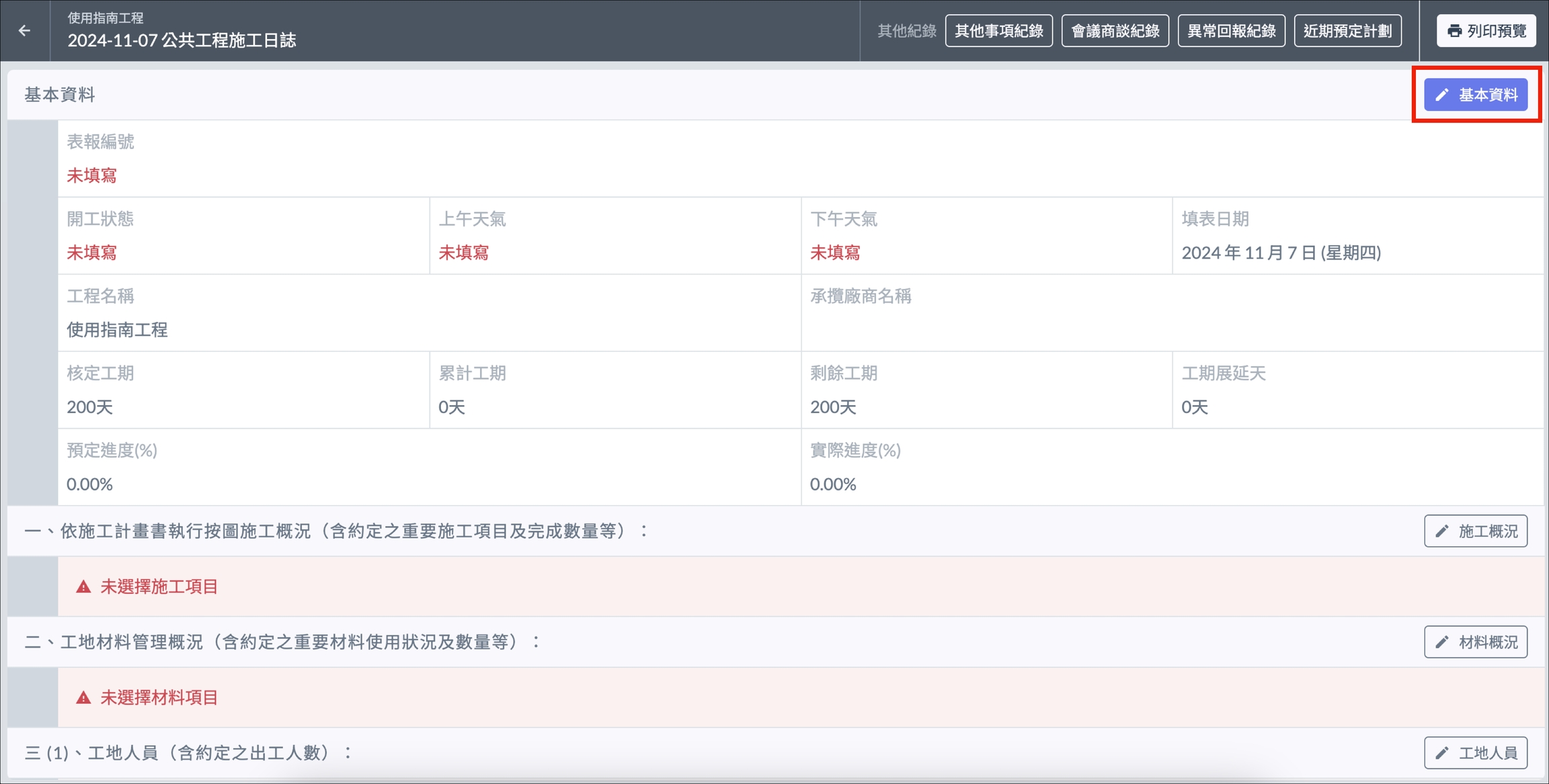 點選右上角 「 基本資料 」,填寫開工狀態 ( 必填 )、表報編號、上午天氣、下午天氣等資訊,完成後點選 「 儲存變更 」。