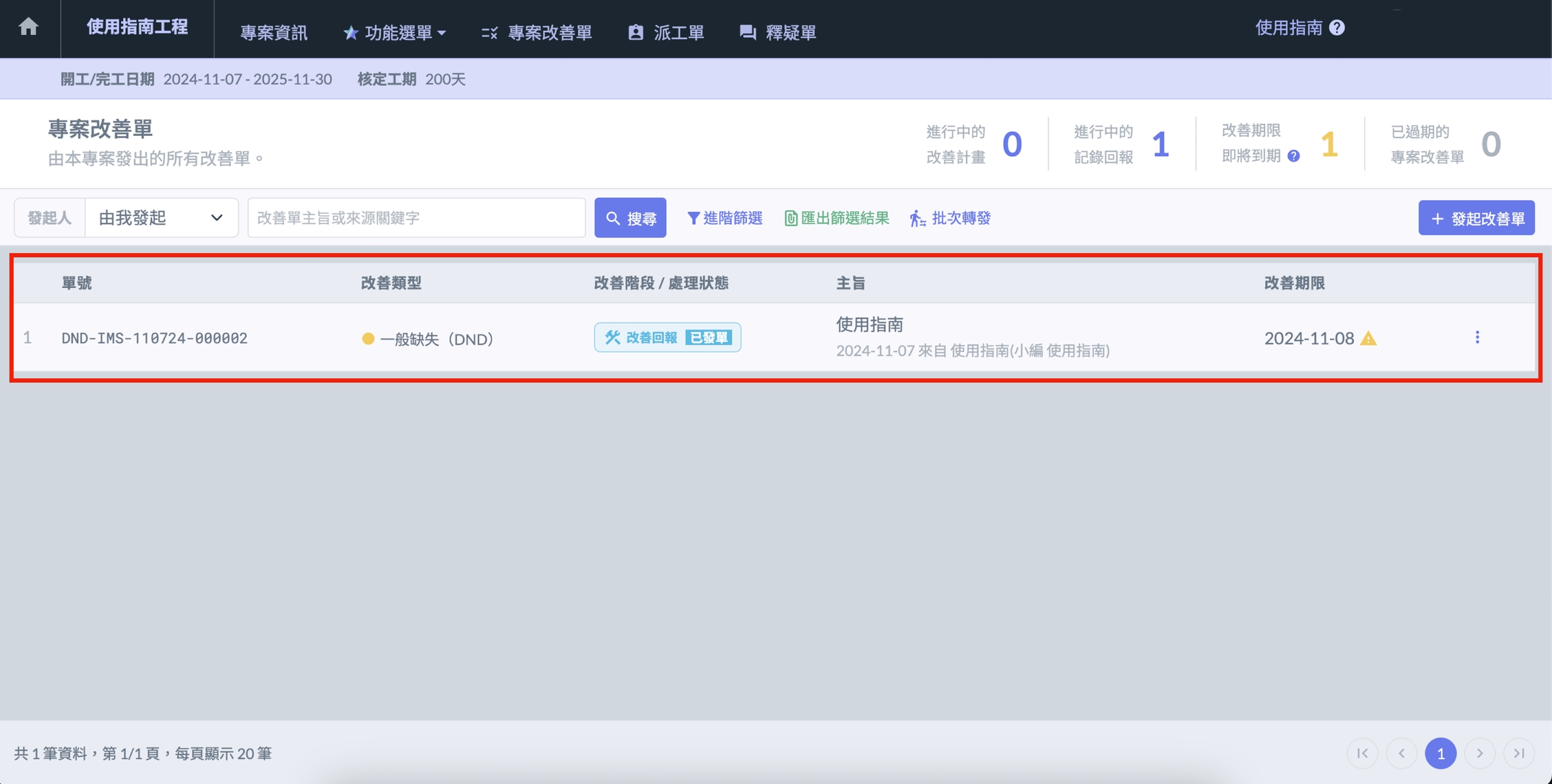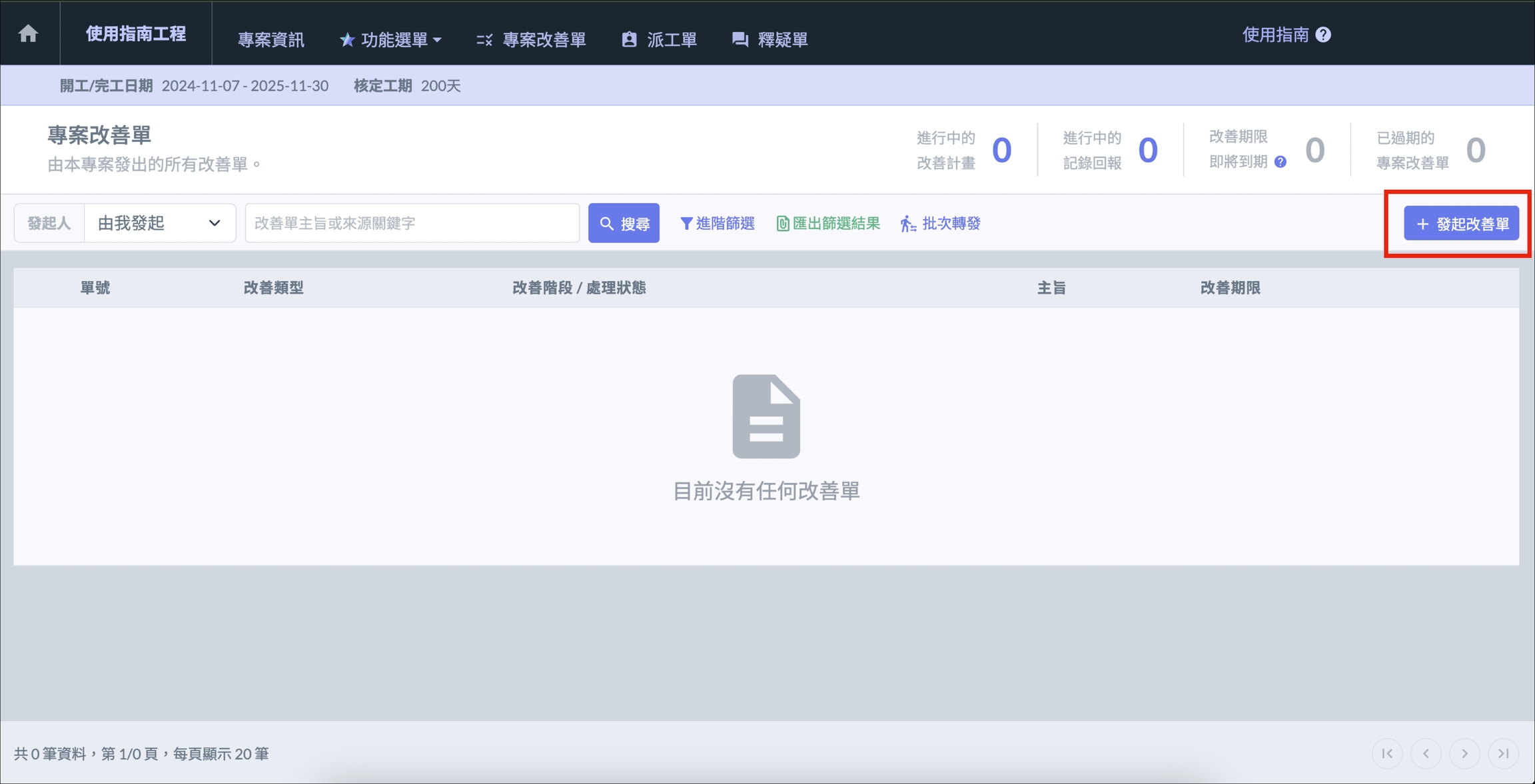 在專案清單中選擇公司專案,點選 「 專案改善單 」 進入改善單介面,選擇右上角 「 +發起改善單 」,填寫內容後,即可發起改善單。