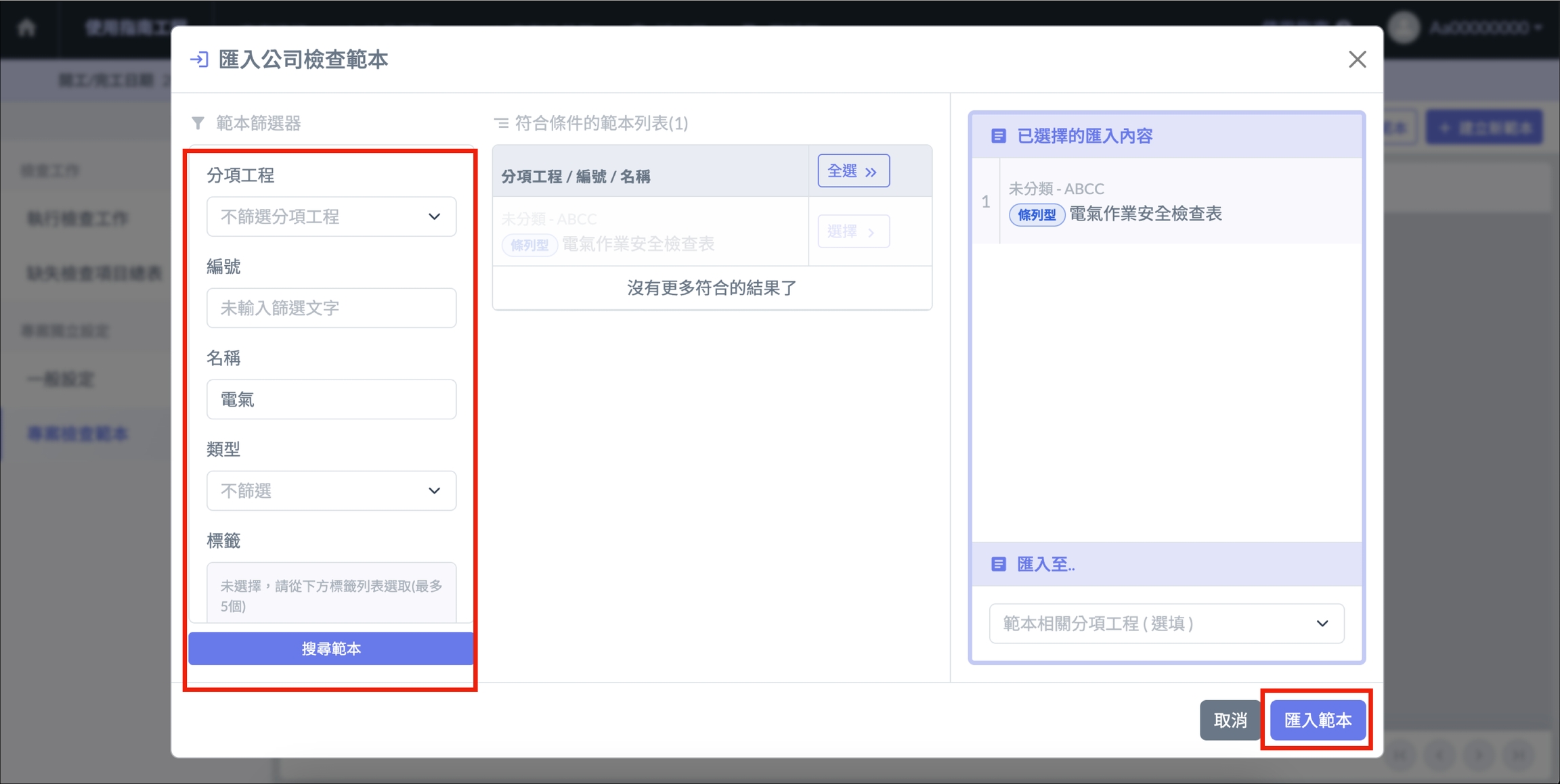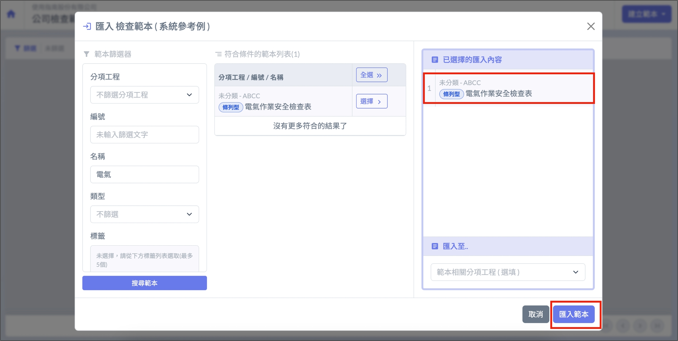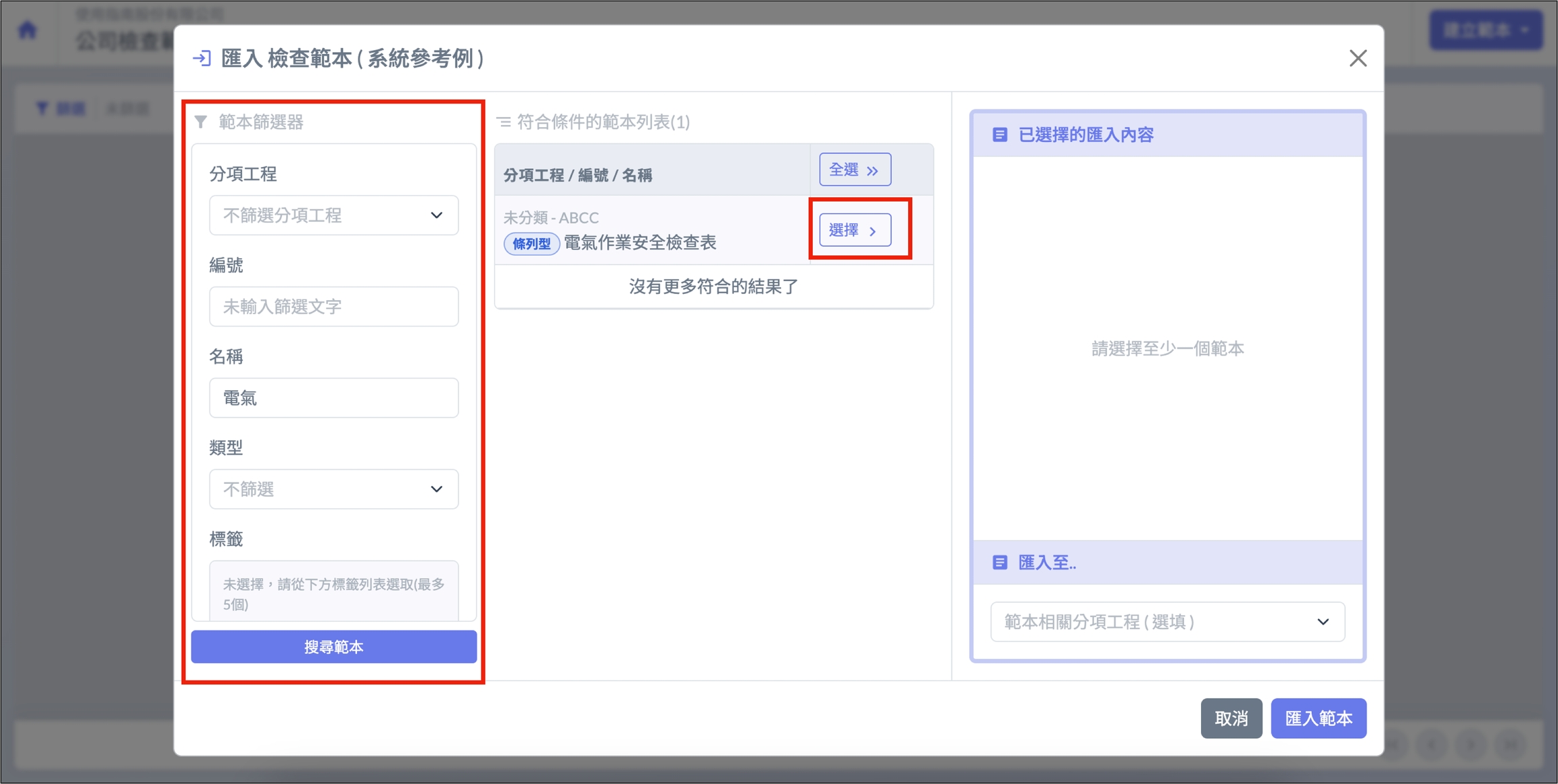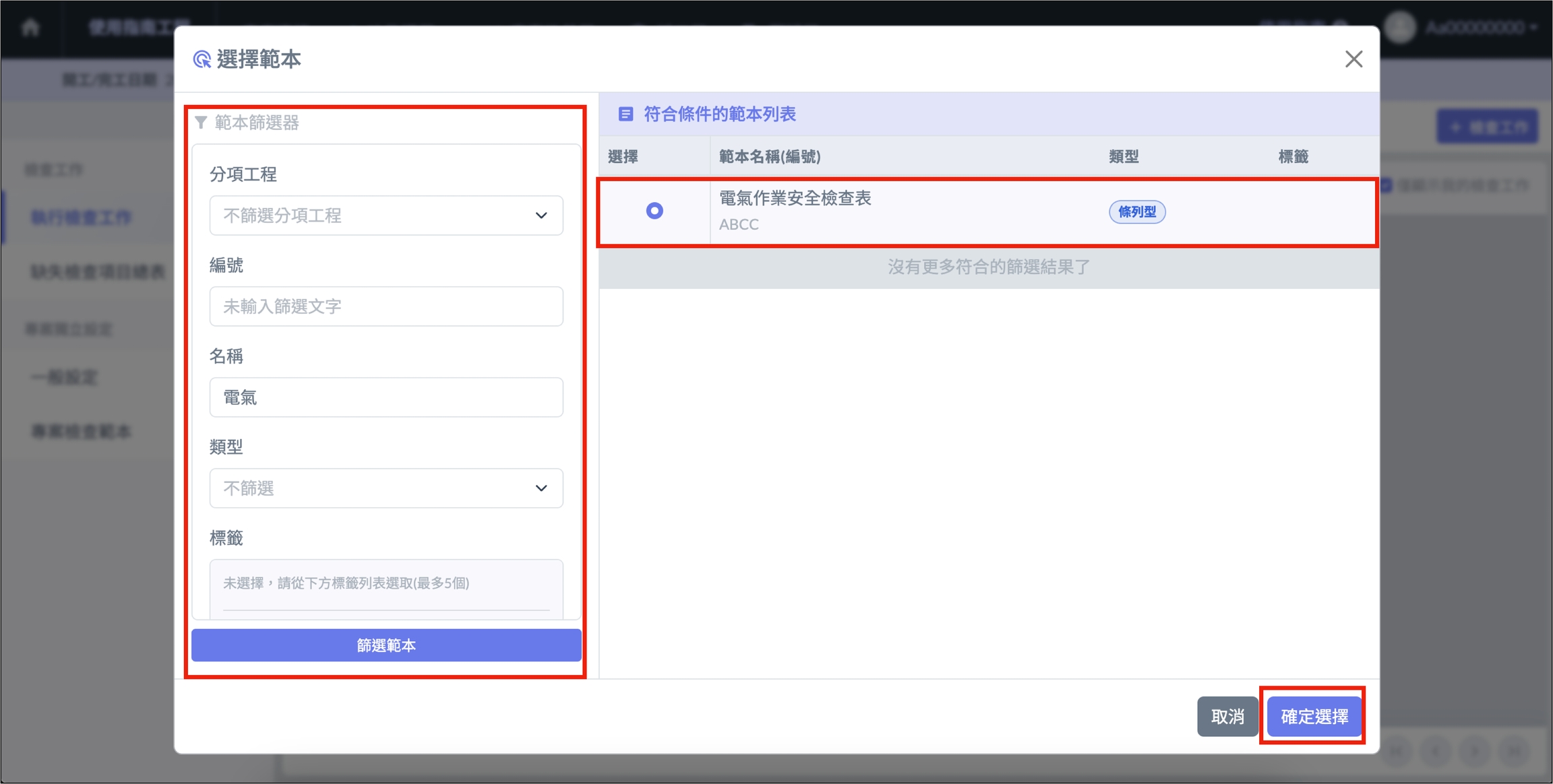 點選 「 選用檢查範本 」,用篩選器找到需要的範本後,點選 「 確定選擇 」。