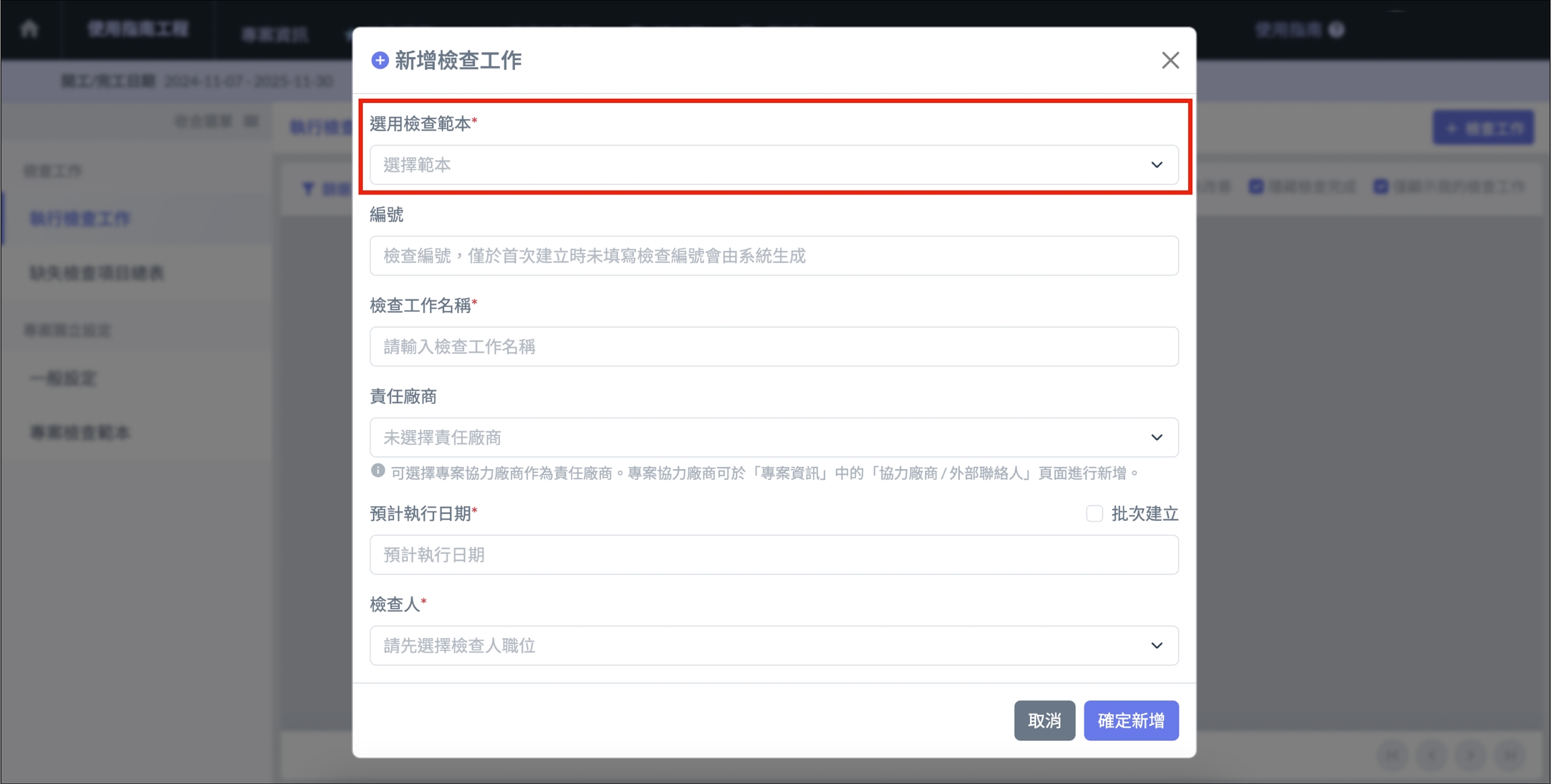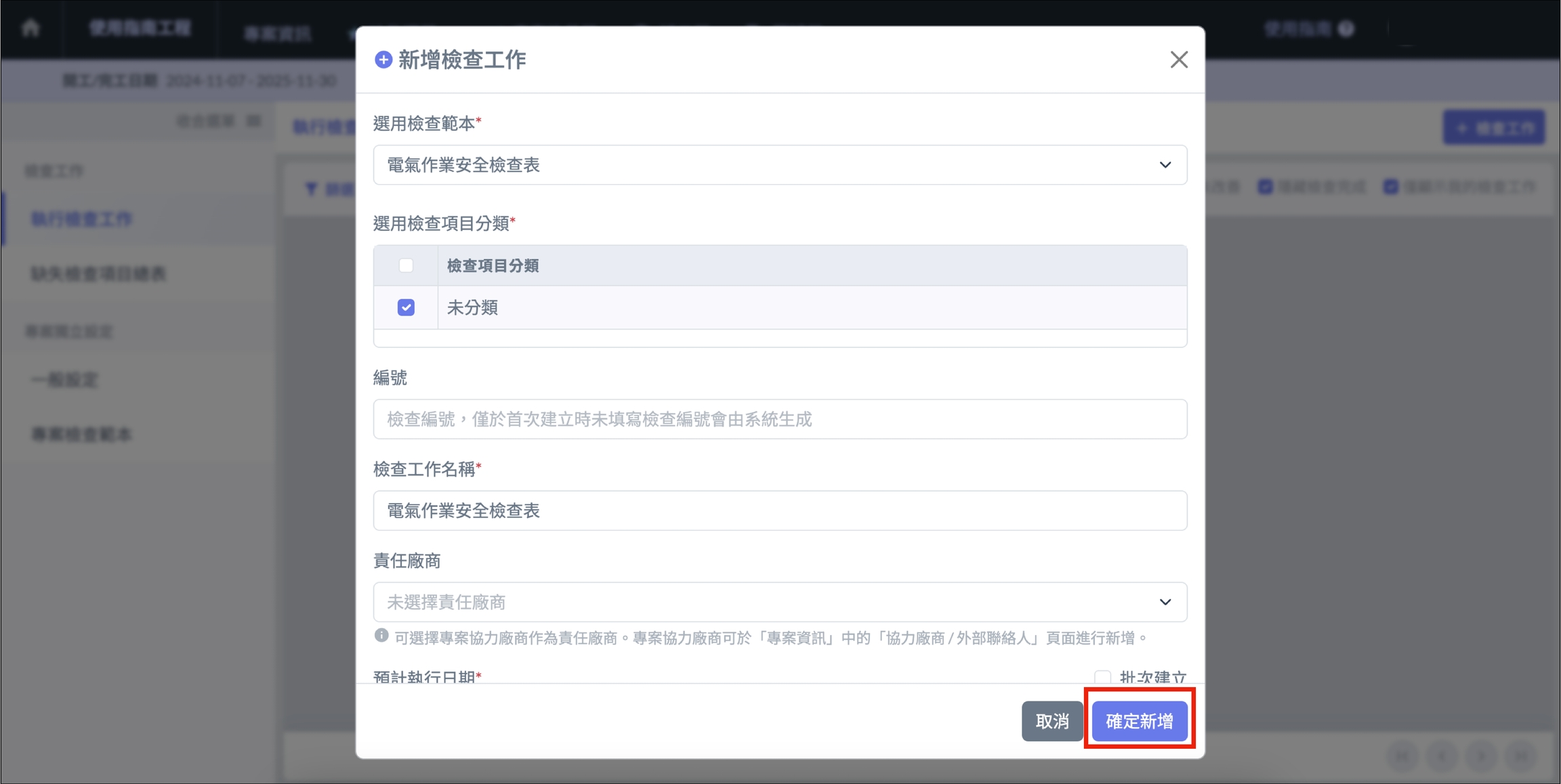 依序填入預計執行日期、檢查人等必填資訊後,選擇 「 確定新增 」。