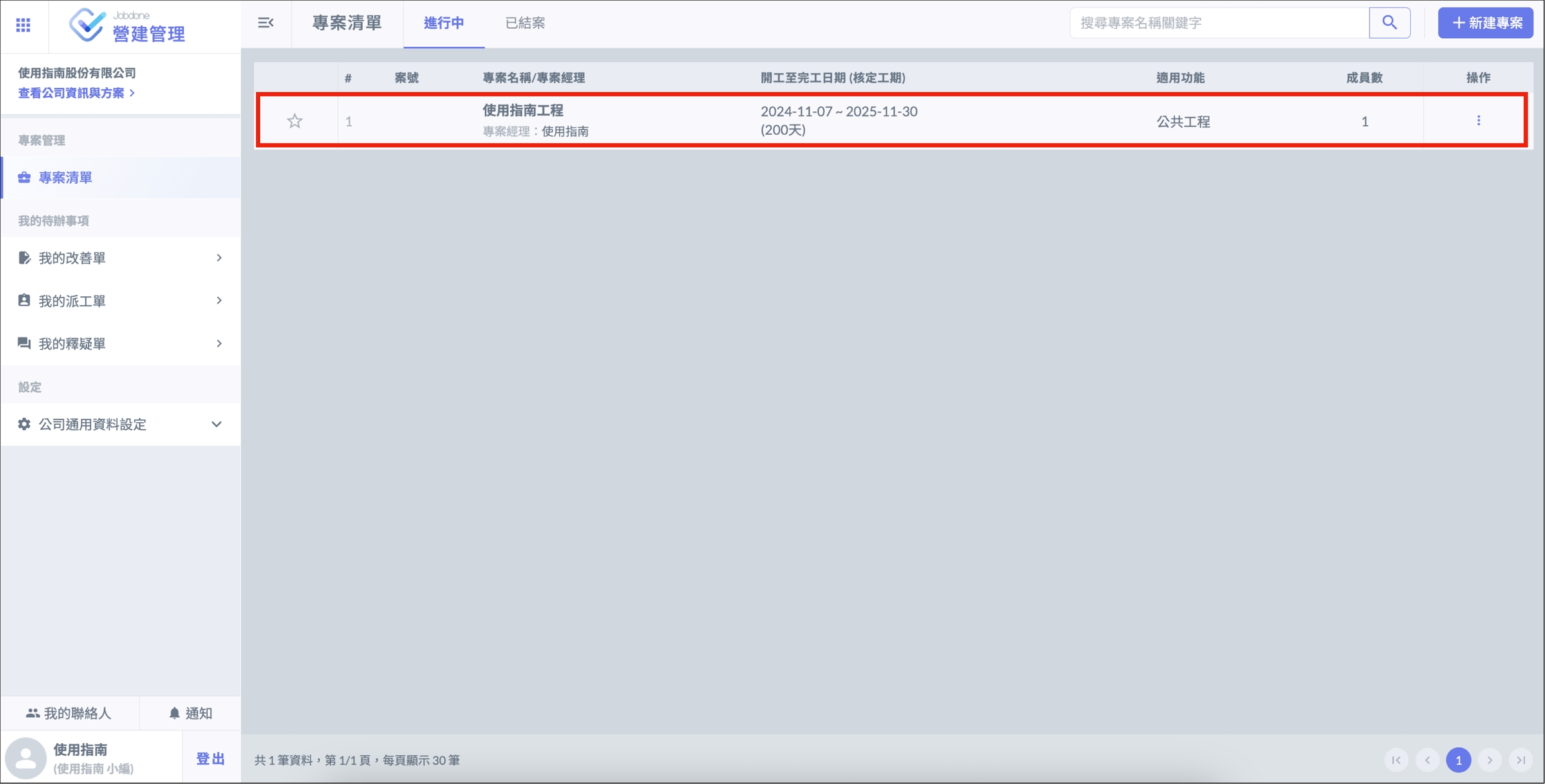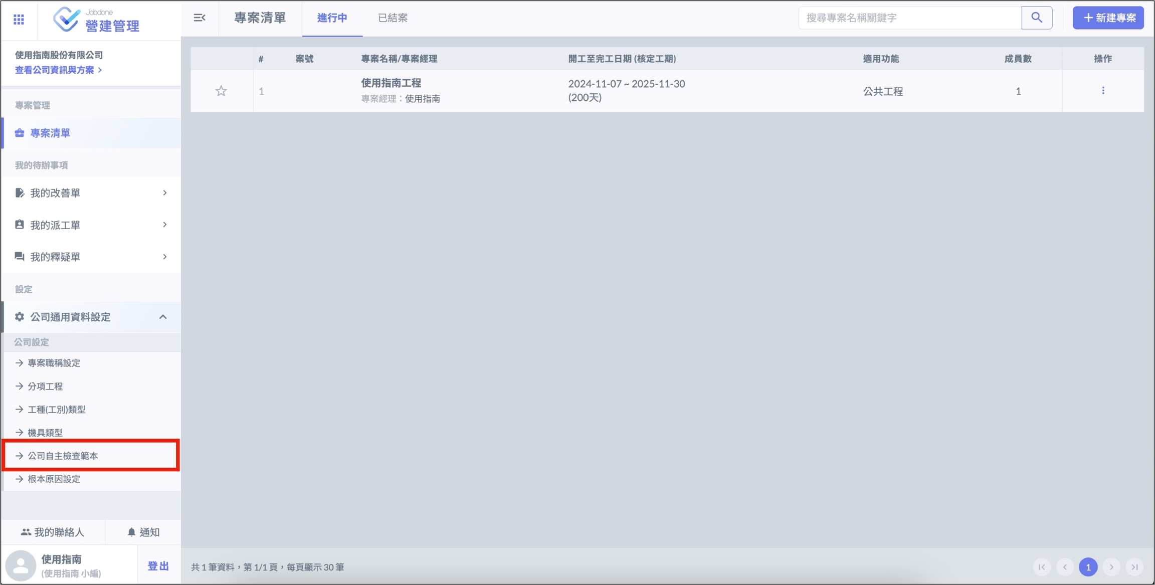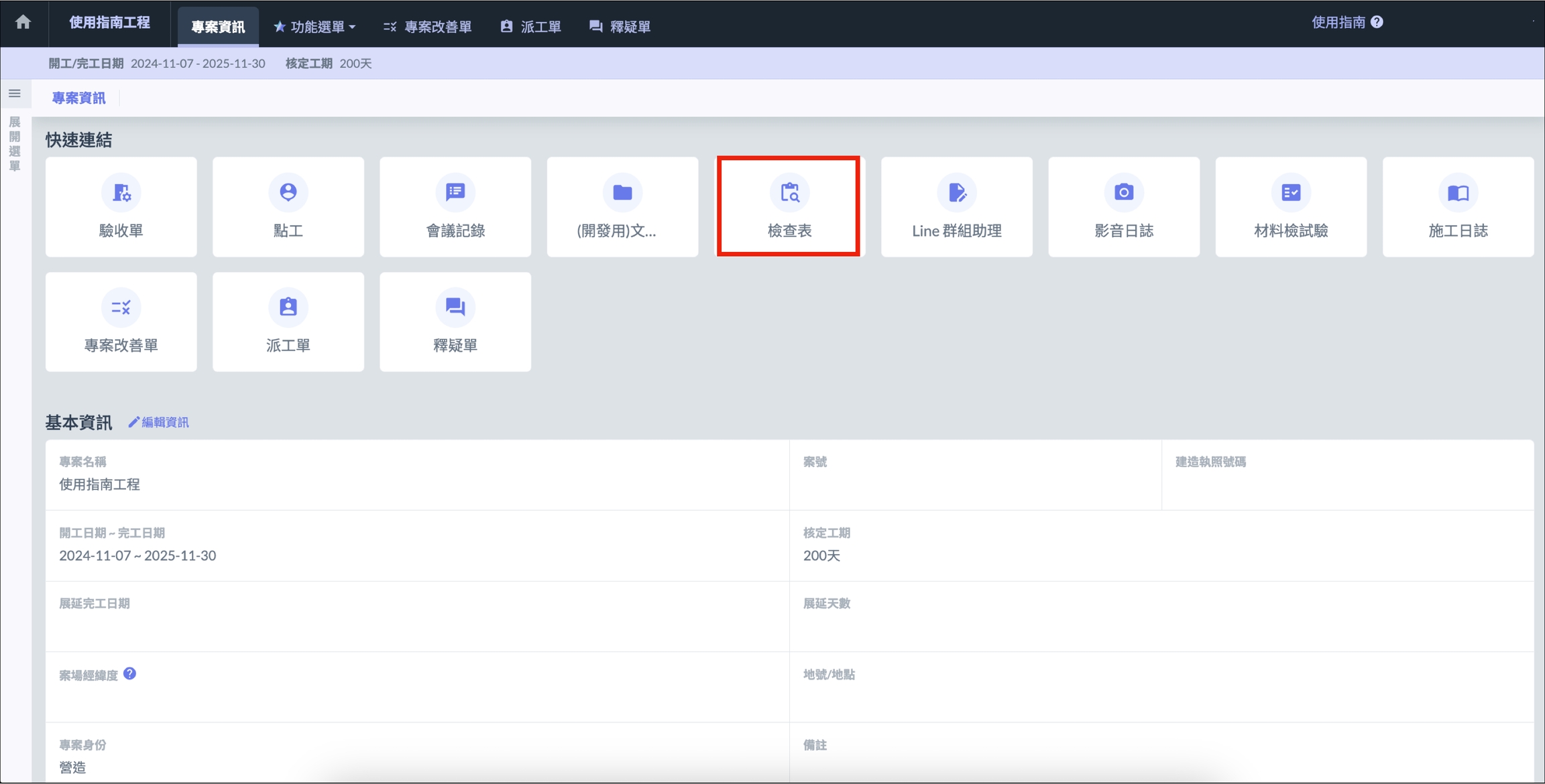 選擇要建立檢查表的專案,點選 「 檢查表 」 進入專案檢查表介面。