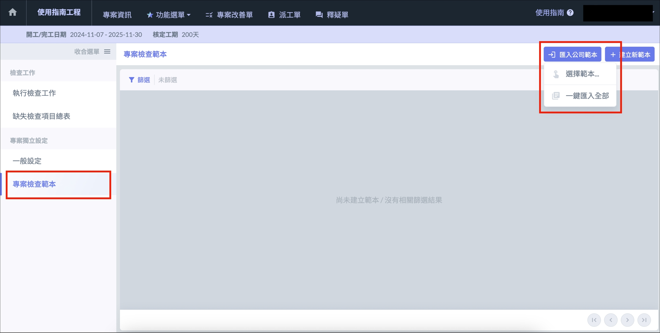 選擇左側選單中的 「 專案檢查範本 」,然後點選右上角 「 匯入公司範本 」 中的 「 選擇範本 」。