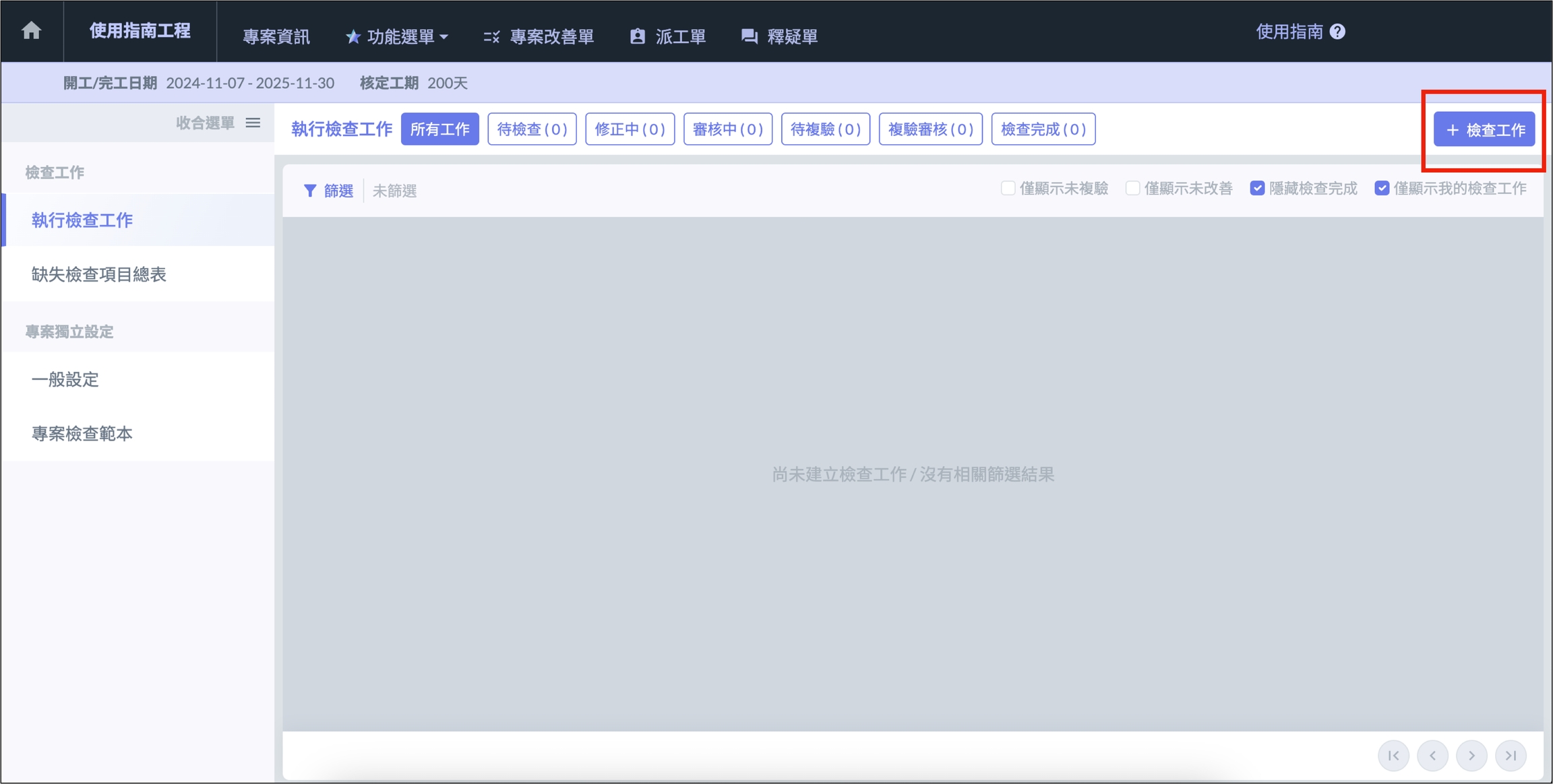 進入專案檢查表介面後,在左側選單中選擇 「 執行檢查工作 」,點選右上角 「 +檢查工作 」