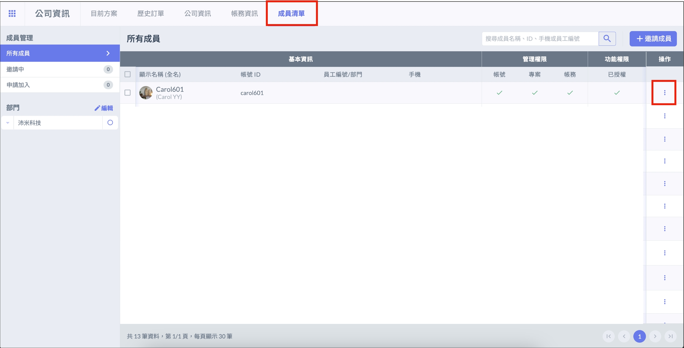 建立或加入公司後,點選 「 查看公司資訊與方案 」,選擇 「 成員清單 」,在要授權的成員旁邊點選 「 ⋮ 」,將 「 企業版模組 」 一欄打開後點選 「 儲存 」。