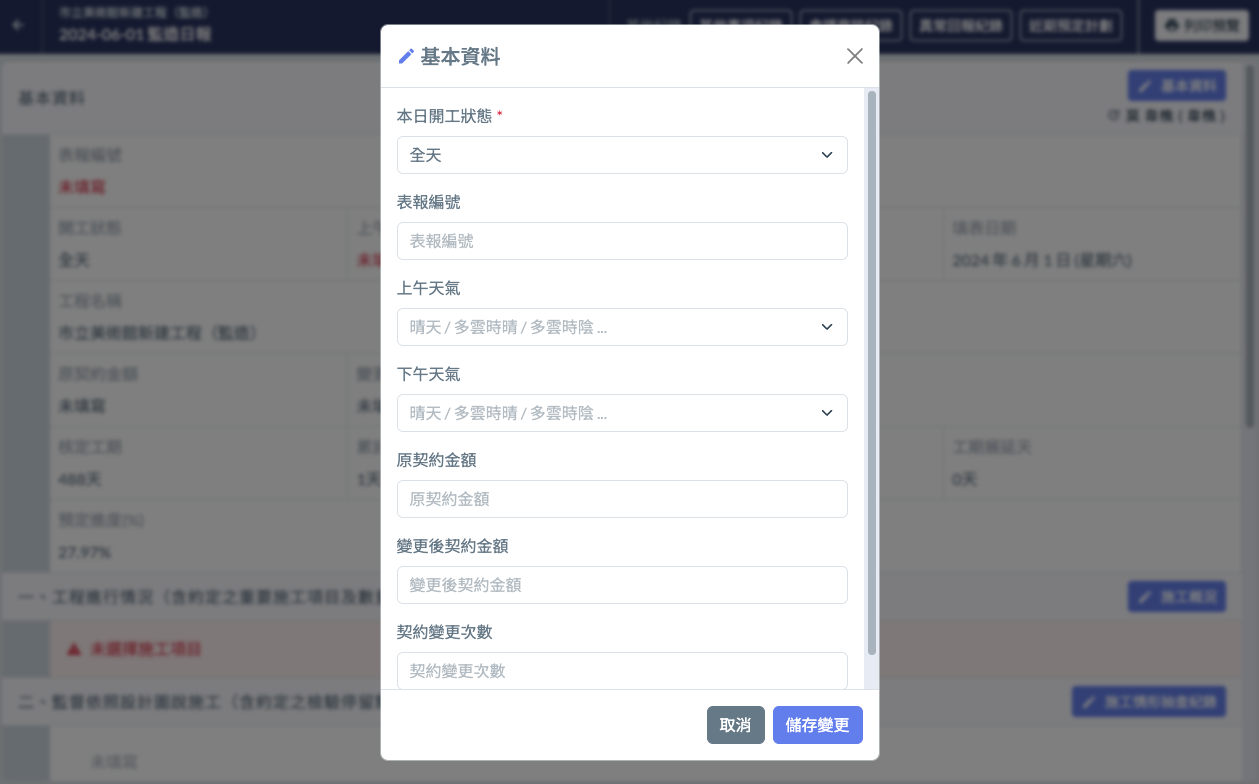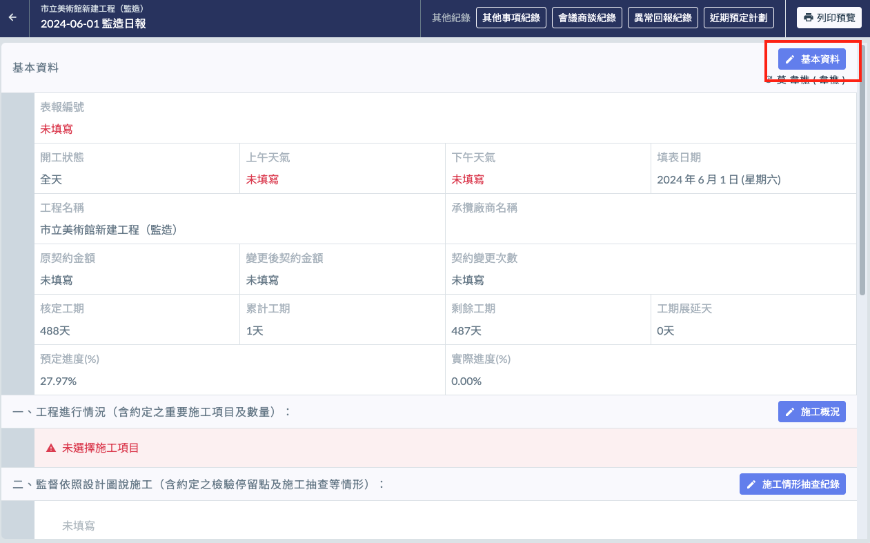 其它資訊由系統智慧辨識帶入,填寫日報其他內容之前,必須先填寫專案基本資訊。