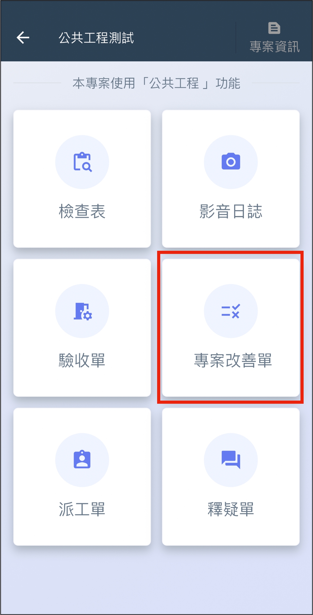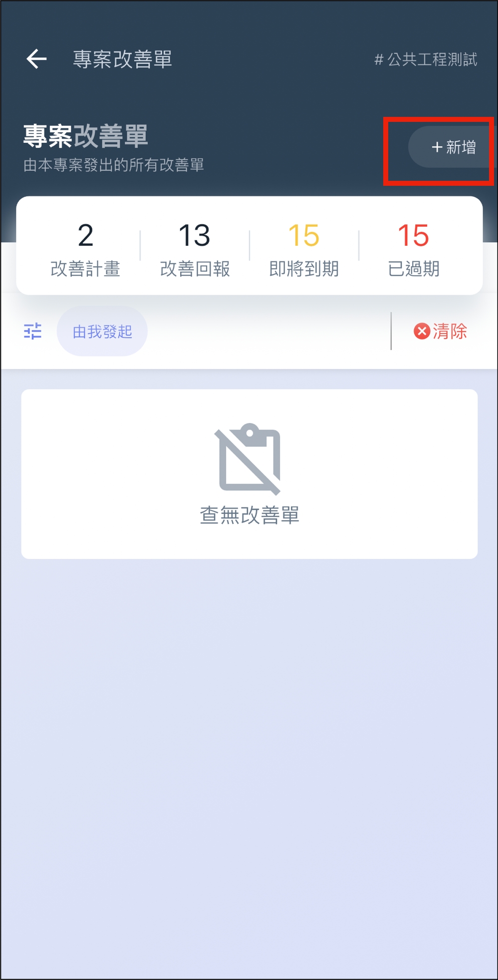 進入 APP 後,點選 「 我的專案」,選擇 「 專案改善單 」,即可點選右上角 「 + 新增 」 直接發起改善單。