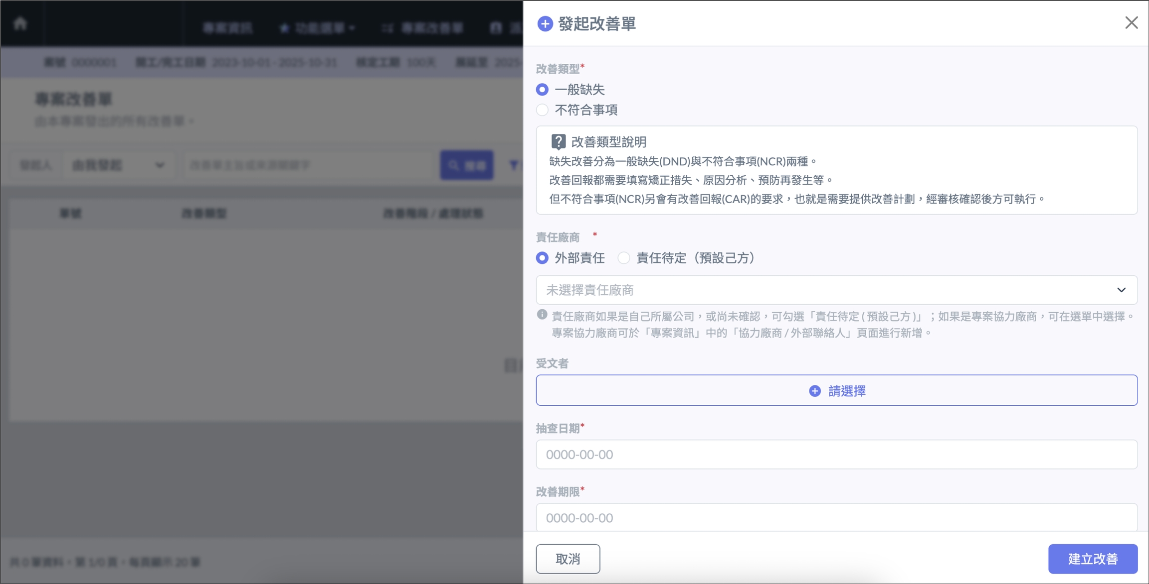 進入專案改善單後,點選右側 「 + 發起改善單 」 按鈕,即可發起改善單。