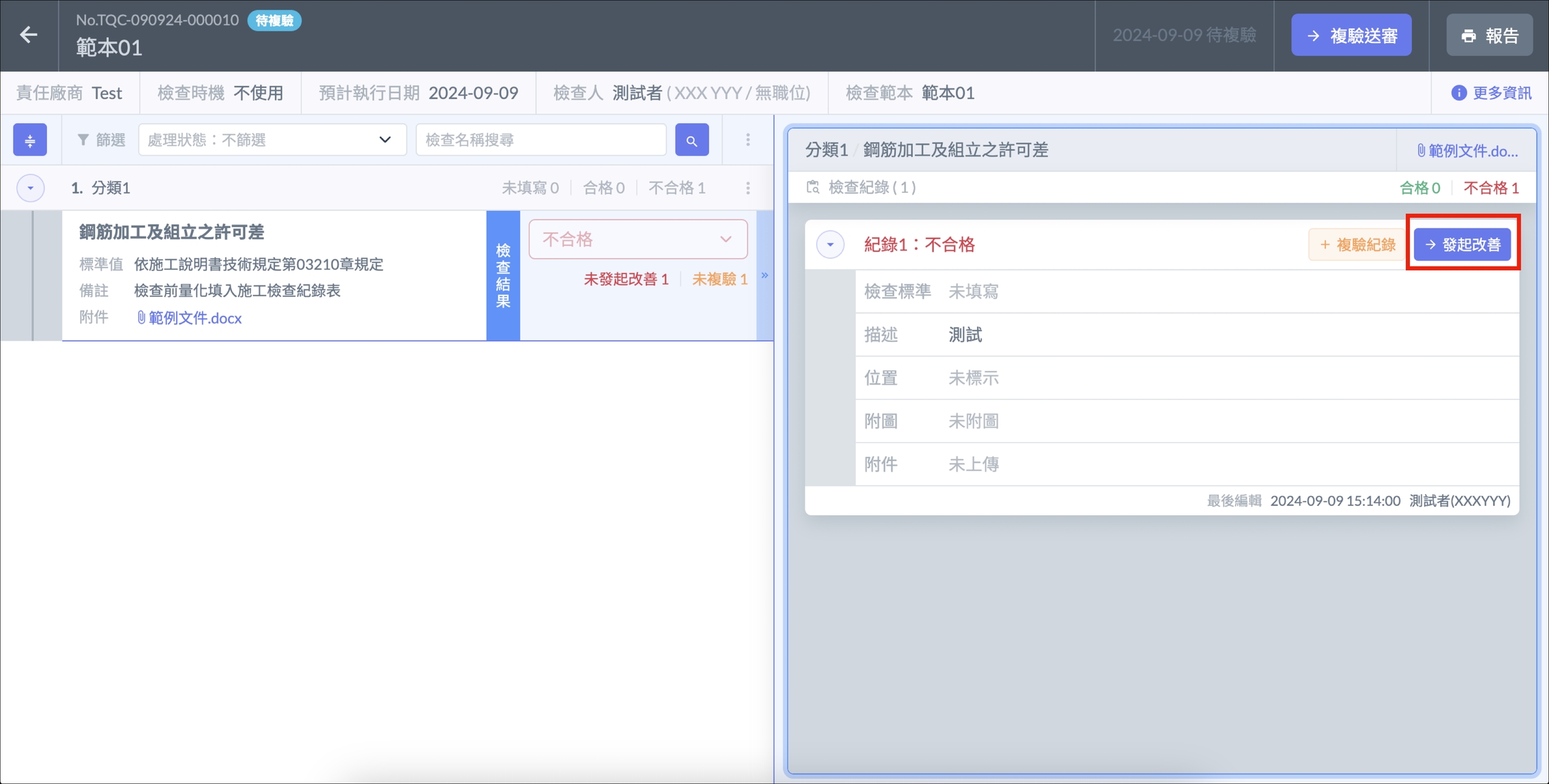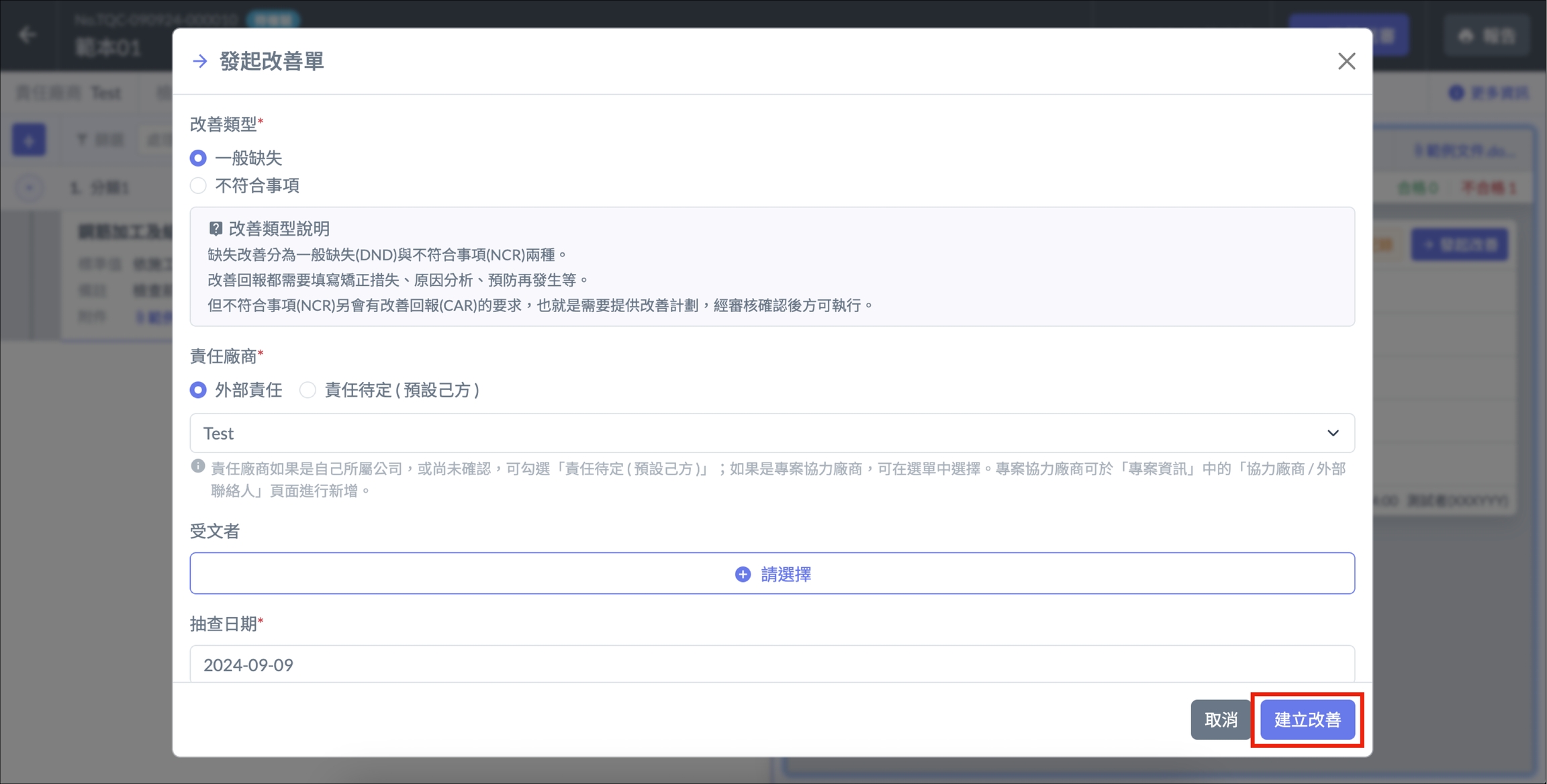 進入結案的自主檢查後,在不合格紀錄右方點選 「 建立改善單 」,即可填寫改善單類型及發起改善單。